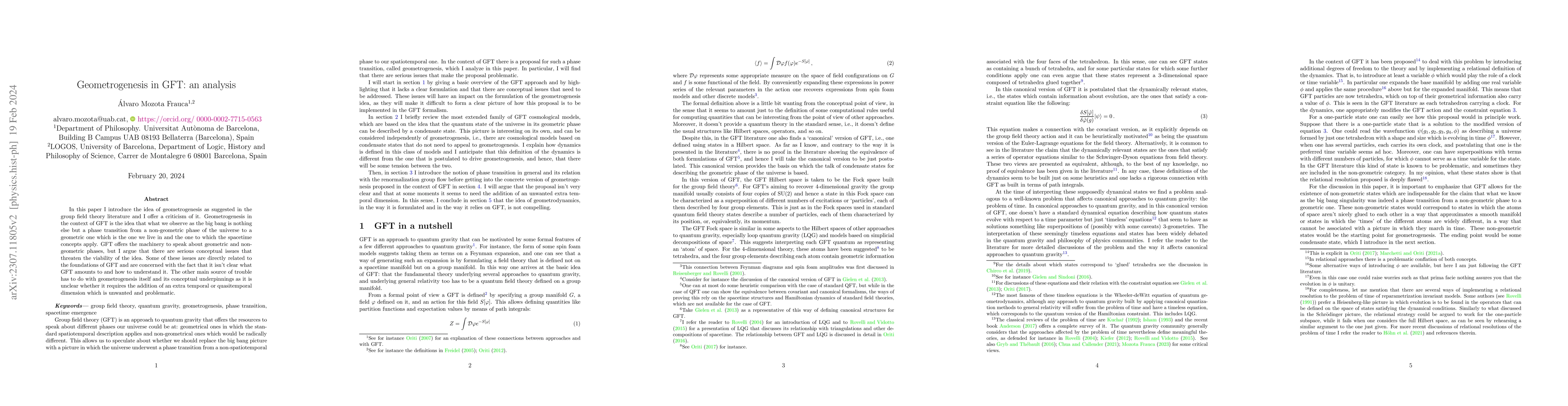 This paper critiques the concept of geometrogenesis in group field theory (GFT), arguing that it posits a phase transition from a non-geometric to a geometric universe, but faces conceptual issues, including unclear foundations of GFT and the problematic addition of an extra temporal dimension.