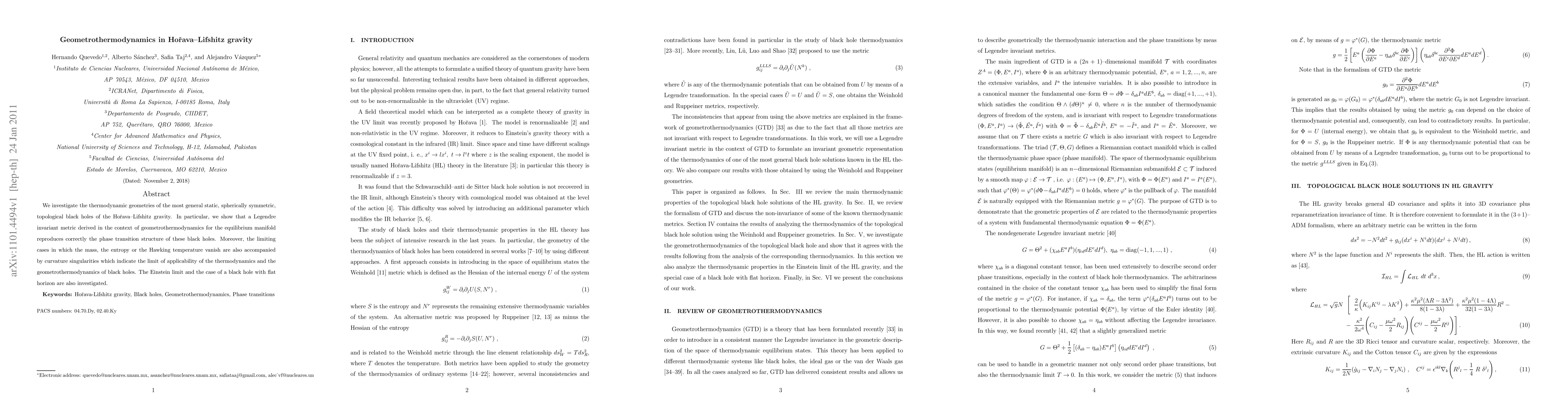 We investigate the thermodynamic geometries of the most general static, spherically symmetric, topological black holes of the Ho\v{r}ava--Lifshitz gravity. In particular, we show that a Legendre invariant metric derived in the context of geometrothermodynamics for the equilibrium manifold reproduces correctly the phase transition structure of these black holes. Moreover, the limiting cases in which the mass, the entropy or the Hawking temperature vanish are also accompanied by curvature singularities which indicate the limit of applicability of the thermodynamics and the geometrothermodynamics of black holes. The Einstein limit and the case of a black hole with flat horizon are also investigated.