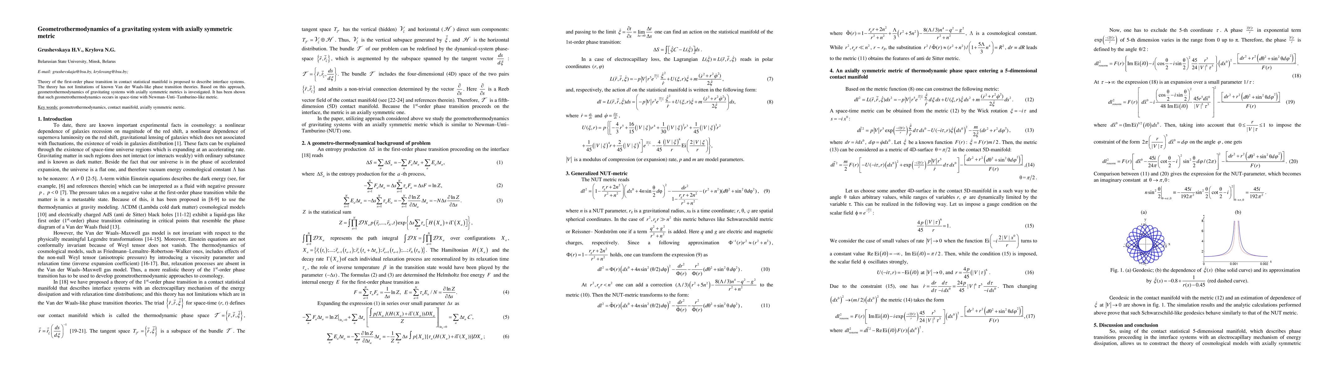 The paper proposes a new theory for first-order phase transitions in interface systems, unlimited by existing Van der Waals-like theories. It demonstrates that geometrothermodynamics of gravitating systems with axially symmetric metric applies in space-time using the Newman-Unti-Tamburino metric.