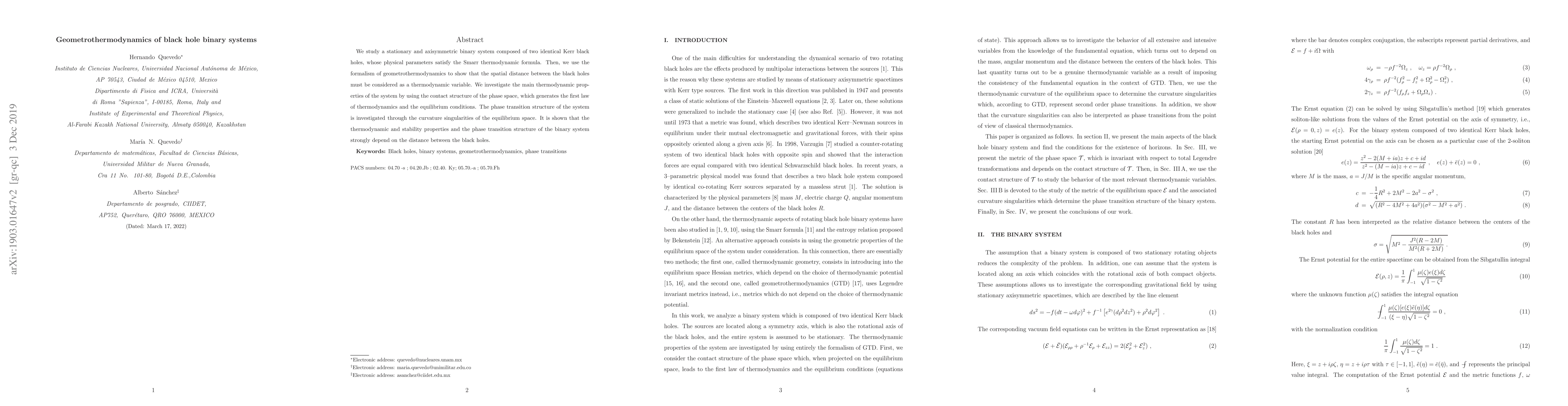 We study a stationary and axisymmetric binary system composed of two identical Kerr black holes, whose physical parameters satisfy the Smarr thermodynamic formula. Then, we use the formalism of geometrothermodynamics to show that the spatial distance between the black holes must be considered as a thermodynamic variable. We investigate the main thermodynamic properties of the system by using the contact structure of the phase space, which generates the first law of thermodynamics and the equilibrium conditions. The phase transition structure of the system is investigated through the curvature singularities of the equilibrium space. It is shown that the thermodynamic and stability properties and the phase transition structure of the binary system strongly depend on the distance between the black holes.
