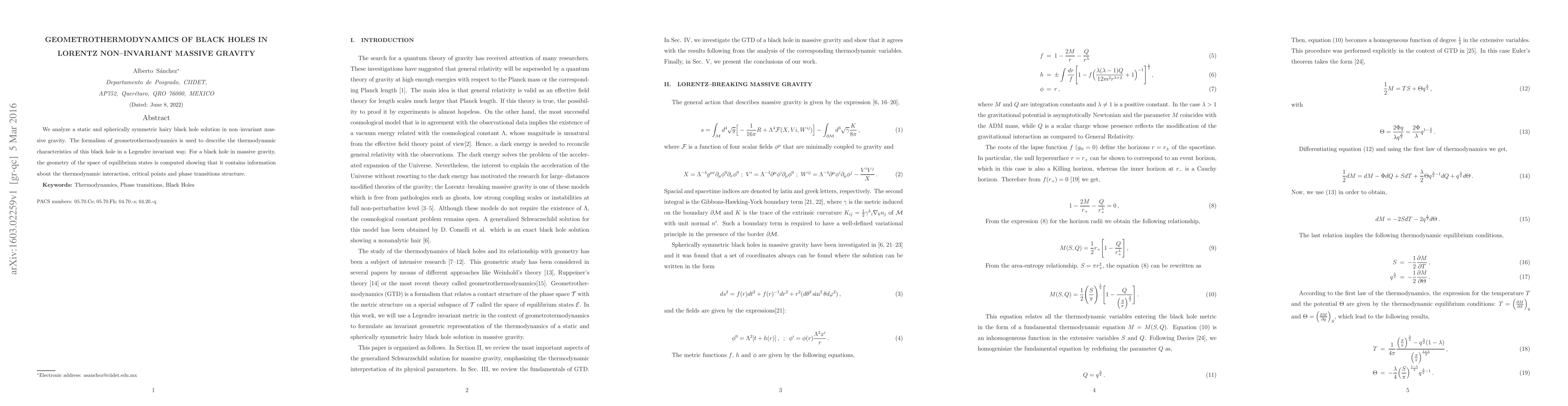 We analyze a static and spherically symmetric hairy black hole solution in non-invariant massive gravity. The formalism of geometrothermodynamics is used to describe the thermodynamic characteristics of this black hole in a Legendre invariant way. For a black hole in massive gravity, the geometry of the space of equilibrium states is computed showing that it contains information about the thermodynamic interaction, critical points and phase transitions structure.