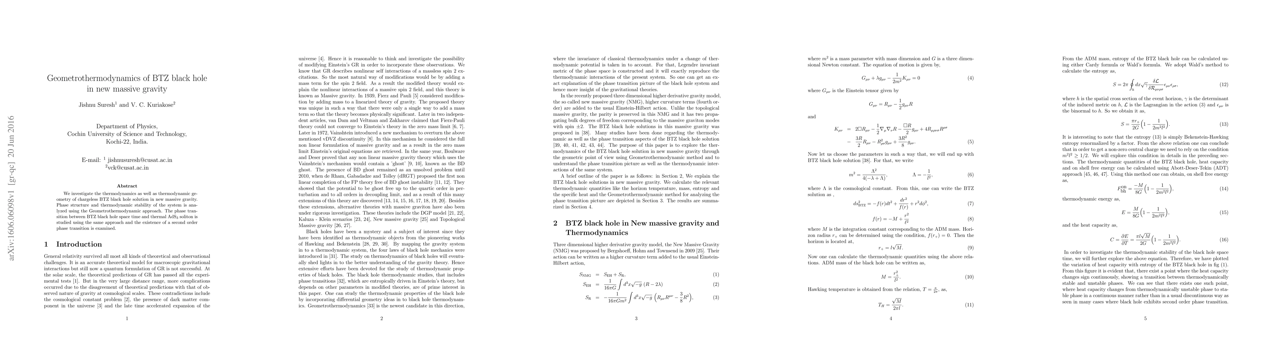 This paper examines the thermodynamics and geometric properties of a chargeless BTZ black hole in the context of new massive gravity, utilizing the Geometrothermodynamics approach to analyze phase transitions and stability, and finds evidence of a second-order phase transition between the BTZ spacetime and thermal AdS$_3$ soliton.