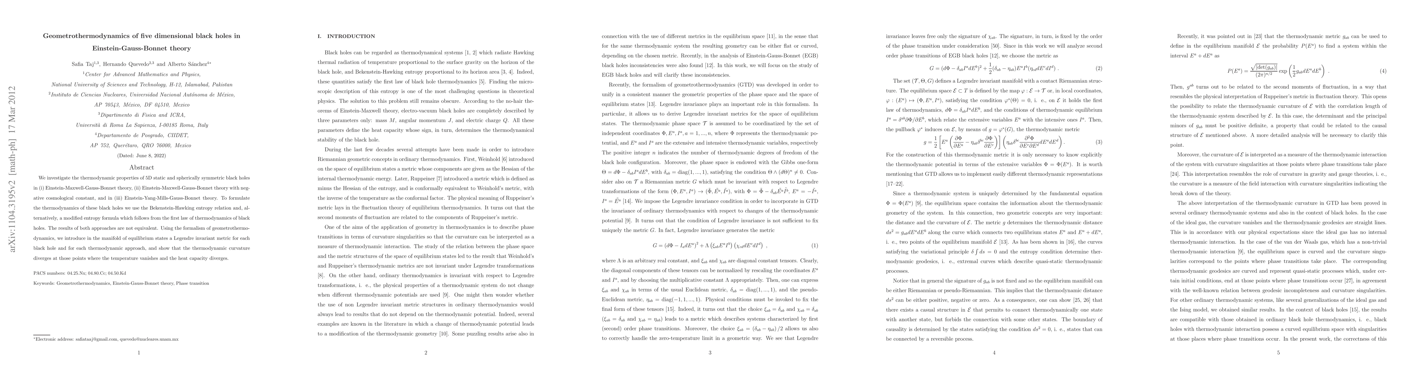 This paper examines the thermodynamic properties of five-dimensional black holes in various Einstein-Gauss-Bonnet theories, using Bekenstein-Hawking and modified entropy formulas. It introduces a Legendre invariant metric in the manifold of equilibrium states and finds that thermodynamic curvature diverges at points of zero temperature and divergent heat capacity.
