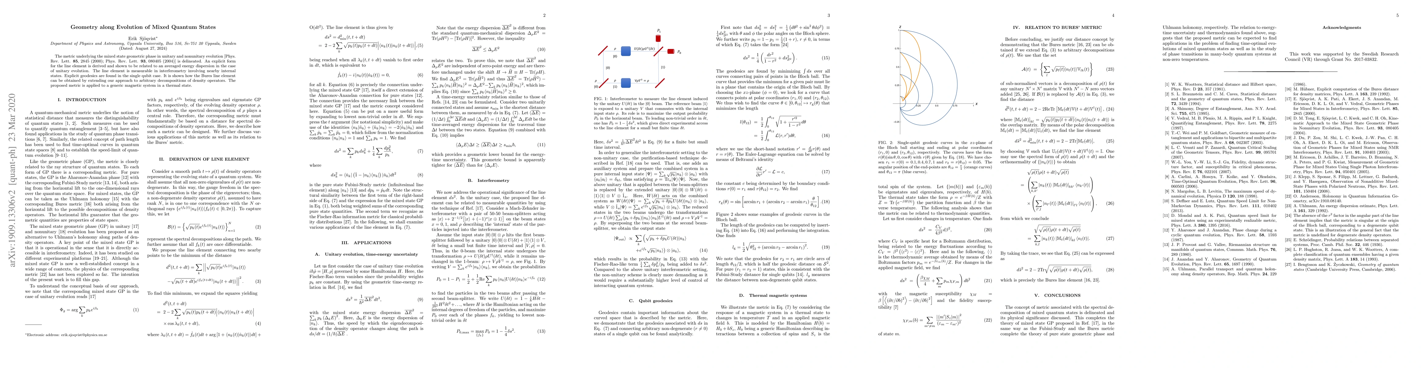 The metric underlying the mixed state geometric phase in unitary and nonunitary evolution [Phys. Rev. Lett. {\bf 85}, 2845 (2000); Phys. Rev. Lett. {\bf 93}, 080405 (2004)] is delineated. An explicit form for the line element is derived and shown to be related to an averaged energy dispersion in the case of unitary evolution. The line element is measurable in interferometry involving nearby internal states. Explicit geodesics are found in the single qubit case. It is shown how the Bures line element can be obtained by extending our approach to arbitrary decompositions of density operators. The proposed metric is applied to a generic magnetic system in a thermal state.
