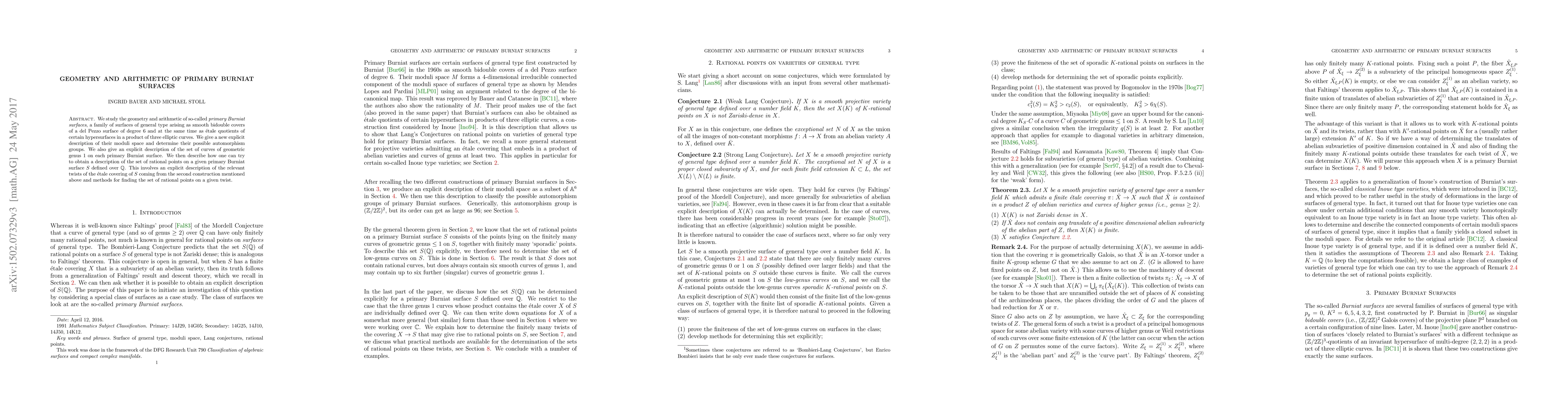 This paper explores the geometry and arithmetic of primary Burniat surfaces, providing an explicit description of their moduli space and automorphism groups, and detailing the set of curves of genus 1 on these surfaces. It also outlines methods for determining the rational points on these surfaces defined over $\mathbb Q$.