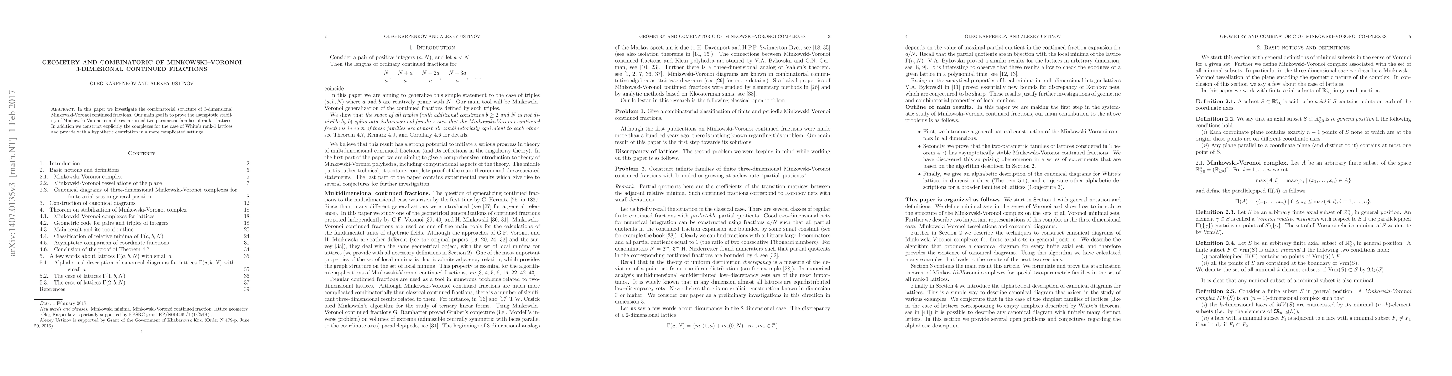 In this paper we investigate the combinatorial structure of 3-dimensional Minkowski-Voronoi continued fractions. Our main goal is to prove the asymptotic stability of Minkowski-Voronoi complexes in special two-parametric families of rank-1 lattices. In addition we construct explicitly the complexes for the case of White's rank-1 lattices and provide with a hypothetic description in a more complicated settings.