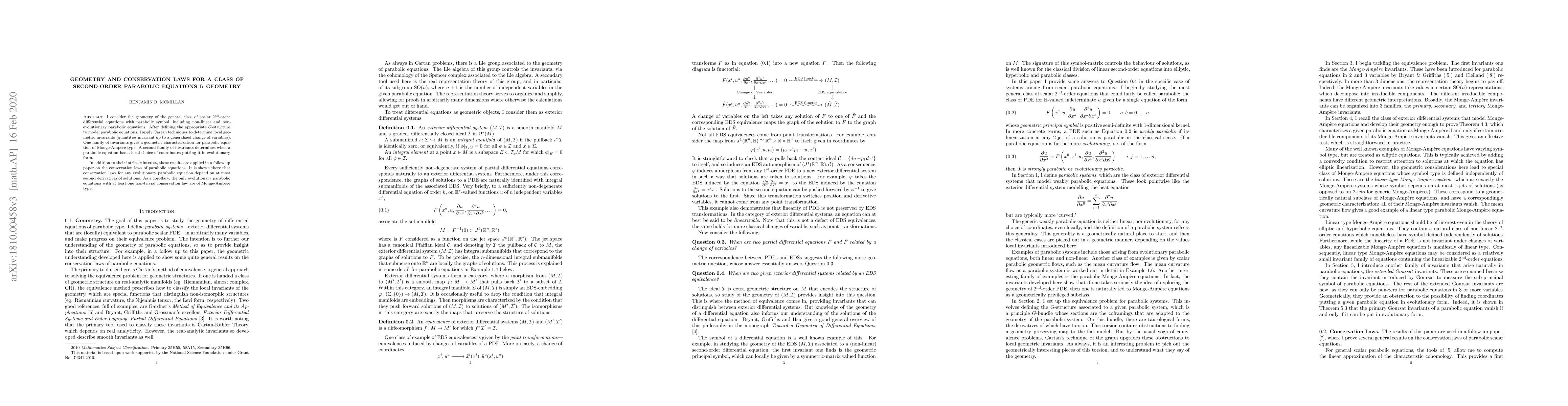 I consider the geometry of the general class of scalar 2nd-order differential equations with parabolic symbol, including non-linear and non-evolutionary parabolic equations. After defining the appropriate $G$-structure to model parabolic equations, I apply Cartan techniques to determine local geometric invariants (quantities invariant up to a generalized change of variables). One family of invariants gives a geometric characterization for parabolic equation of Monge-Amp\`ere type. A second family of invariants determines when a parabolic equation has a local choice of coordinates putting it in evolutionary form. In addition to their intrinsic interest, these results are applied in a follow up paper on the conservation laws of parabolic equations. It is shown there that conservation laws for any evolutionary parabolic equation depend on at most second derivatives of solutions. As a corollary, the only evolutionary parabolic equations with at least one non-trivial conservation law are of Monge-Amp\`ere type.