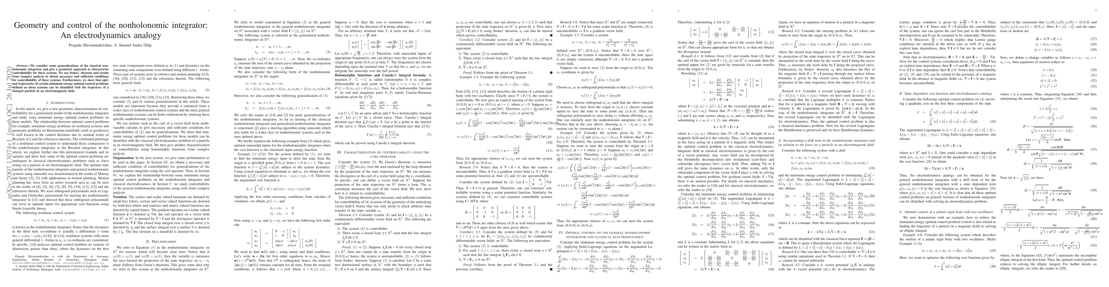 This paper generalizes the classical nonholonomic integrator and employs geometric methods to establish controllability conditions using Stokes' theorem and complex analysis. It also draws an analogy between optimal control trajectories and the motion of a charged particle in an electromagnetic field.