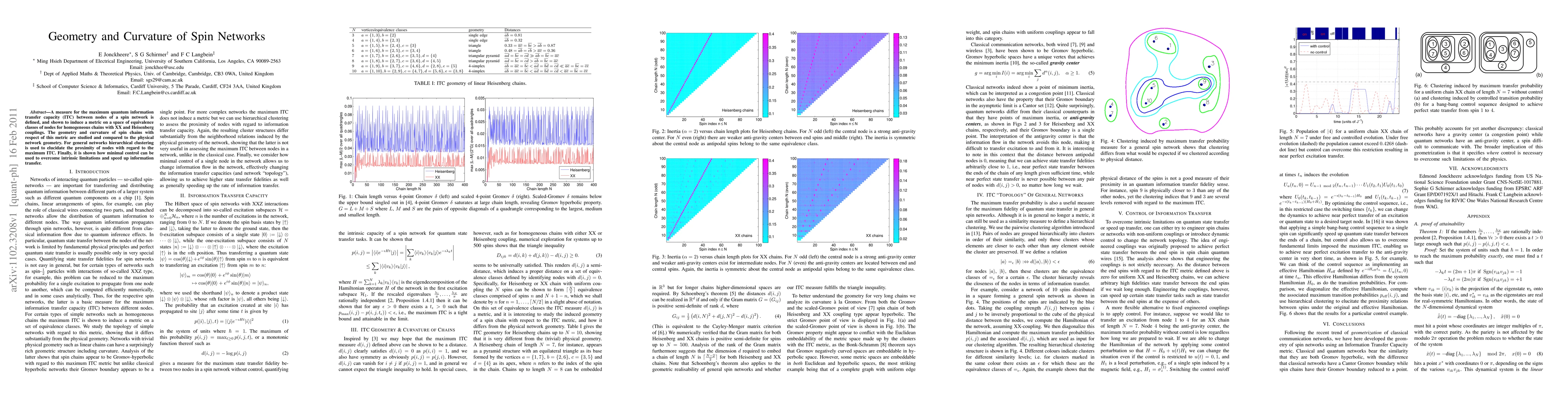 A measure for the maximum quantum information transfer capacity (ITC) between nodes of a spin network is defined, and shown to induce a metric on a space of equivalence classes of nodes for homogeneous chains with XX and Heisenberg couplings. The geometry and curvature of spin chains with respect of this metric are studied and compared to the physical network geometry. For general networks hierarchical clustering is used to elucidate the proximity of nodes with regard to the maximum ITC. Finally, it is shown how minimal control can be used to overcome intrinsic limitations and speed up information transfer.
