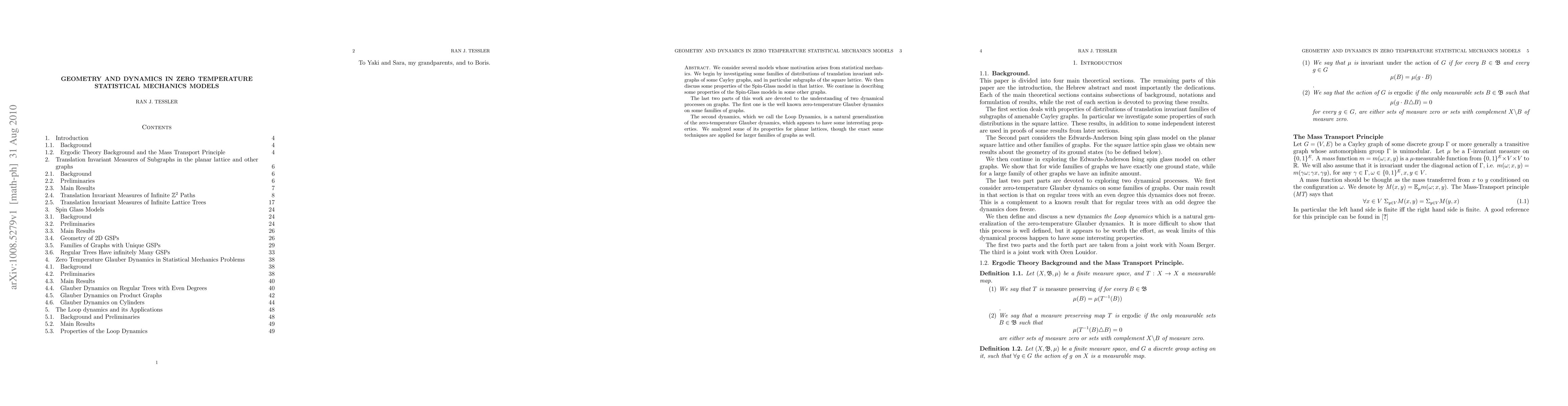 This paper explores various statistical mechanics models, focusing on translation-invariant subgraphs of Cayley graphs and Spin-Glass models. It also introduces the Loop Dynamics, a generalization of zero-temperature Glauber dynamics, analyzing its properties for planar and broader graph families.