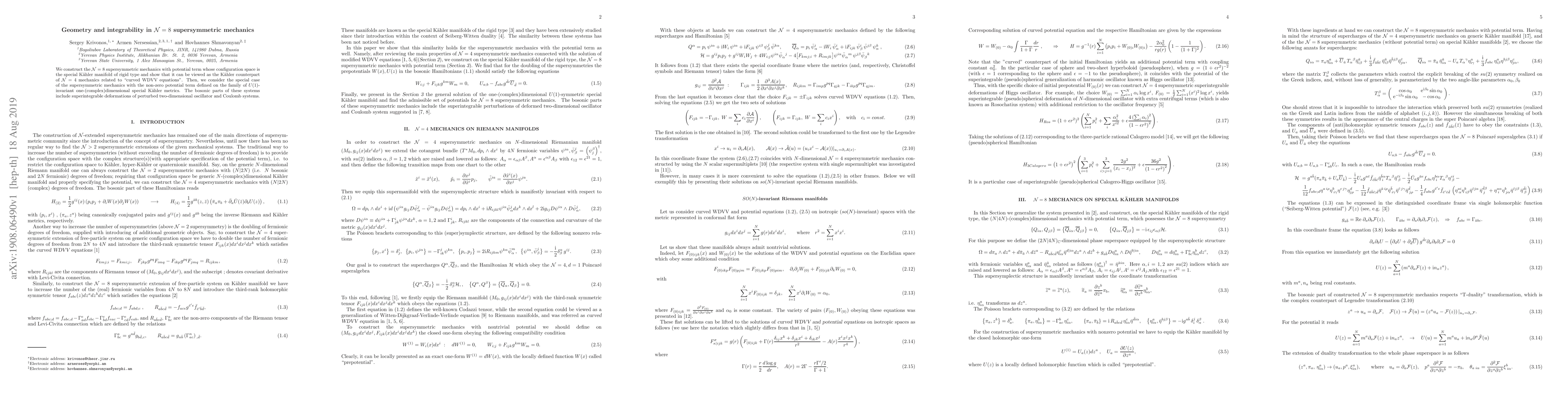 This paper constructs $\mathcal{N}=8$ supersymmetric mechanics on a special Kähler manifold, demonstrating its integrability and relating it to $\mathcal{N}=4$ mechanics via curved WDVV equations. It further explores a special case with $U(1)$-invariant metrics, revealing superintegrable deformations of two-dimensional oscillator and Coulomb systems.