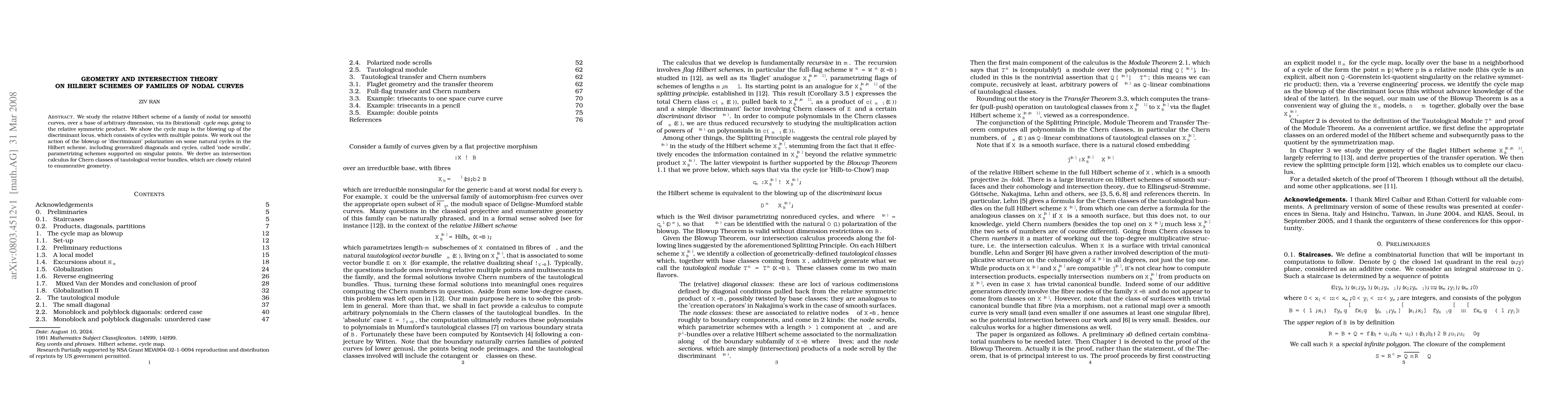 We study the relative Hilbert scheme of a family of nodal (or smooth) curves, over a base of arbitrary dimension, via its (birational) cycle map, going to the relative symmetric product. We show the cycle map is the blowing up of the discriminant locus, which consists of cycles with multiple points. We work out the action of the blowup or 'discriminant' polarization on some natural cycles in the Hilbert scheme, including generalized diagonals and cycles, called 'node scrolls', parametrizing schemes supported on singular points. We derive an intersection calculus for Chern classes of tautological vector bundles, which are closely related to enumerative geometry.