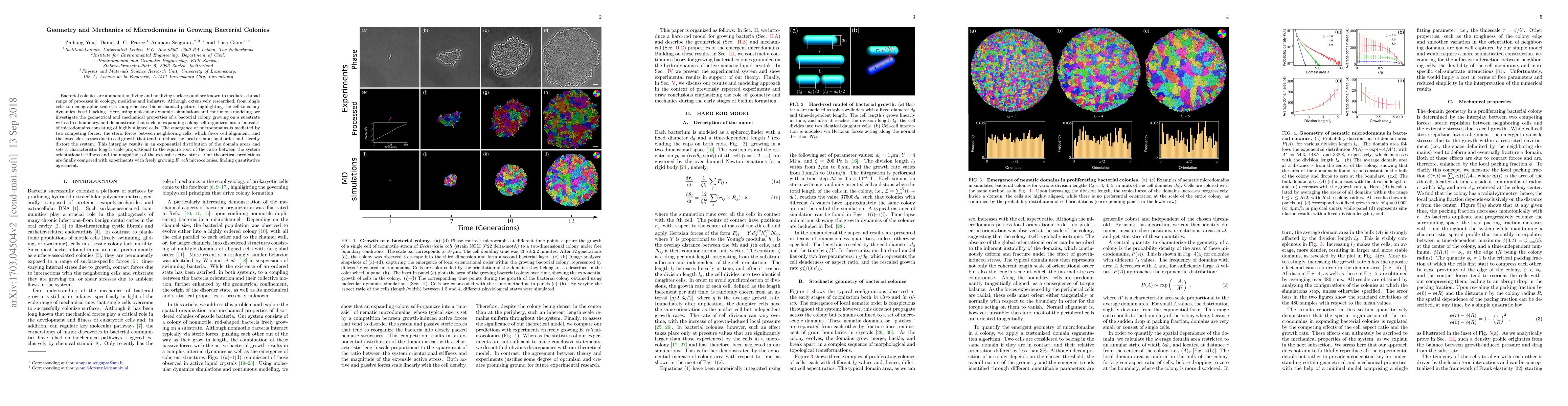 This paper investigates the geometrical and mechanical properties of growing bacterial colonies using simulations and continuous modeling, revealing that colonies self-organize into microdomains of aligned cells due to competing steric and extensile forces. Theoretical predictions match experimental observations of E. coli microcolonies.