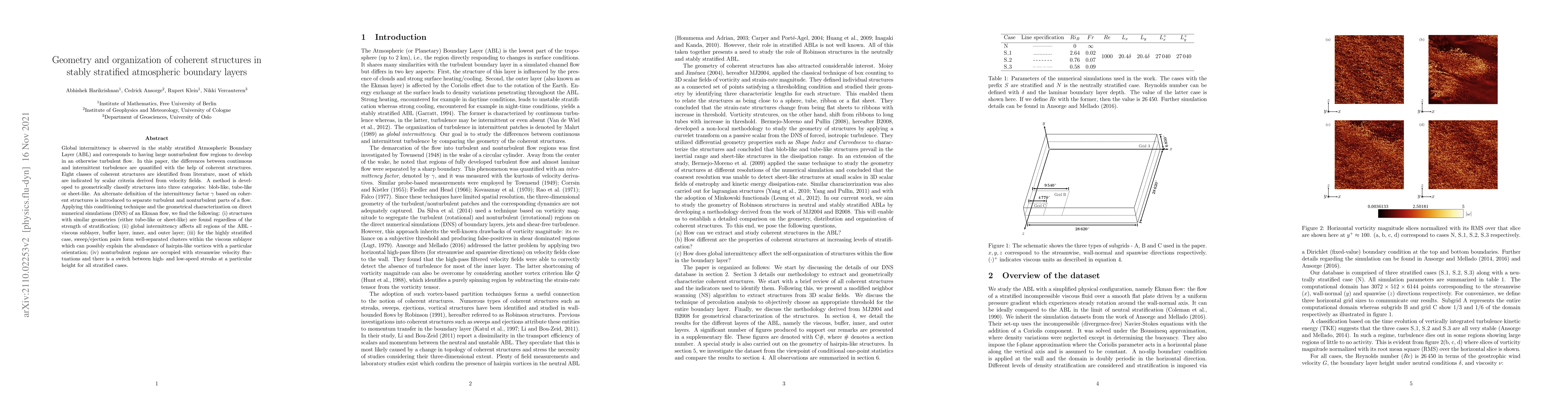 Global intermittency is observed in the stably stratified Atmospheric Boundary Layer (ABL) and corresponds to having large nonturbulent flow regions to develop in an otherwise turbulent flow. In this paper, the differences between continuous and intermittent turbulence are quantified with the help of coherent structures. Eight classes of coherent structures are identified from literature, most of which are indicated by scalar criteria derived from velocity fields. A method is developed to geometrically classify structures into three categories: blob-like, tube-like or sheet-like. An alternate definition of the intermittency factor $\gamma$ based on coherent structures is introduced to separate turbulent and nonturbulent parts of a flow. Applying this conditioning technique and the geometrical characterization on direct numerical simulations (DNS) of an Ekman flow, we find the following: (i) structures with similar geometries (either tube-like or sheet-like) are found regardless of the strength of stratification; (ii) global intermittency affects all regions of the ABL - viscous sublayer, buffer layer, inner, and outer layer; (iii) for the highly stratified case, sweep/ejection pairs form well-separated clusters within the viscous sublayer which can possibly explain the abundance of hairpin-like vortices with a particular orientation; (iv) nonturbulent regions are occupied with streamwise velocity fluctuations and there is a switch between high- and low-speed streaks at a particular height for all stratified cases.