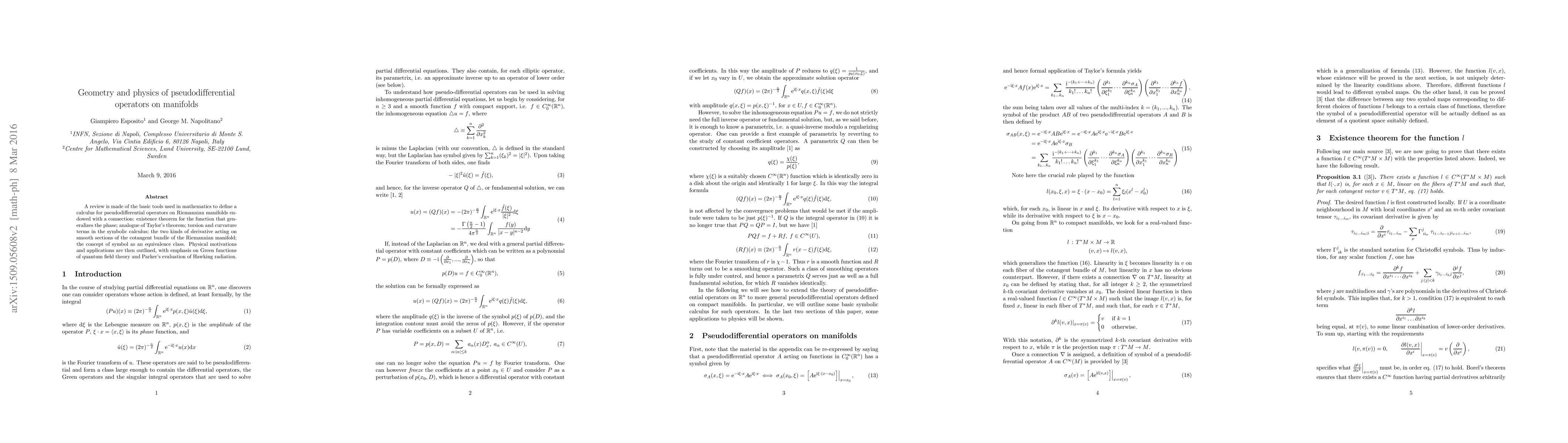 A review is made of the basic tools used in mathematics to define a calculus for pseudodifferential operators on Riemannian manifolds endowed with a connection: esistence theorem for the function that generalizes the phase; analogue of Taylor's theorem; torsion and curvature terms in the symbolic calculus; the two kinds of derivative acting on smooth sections of the cotangent bundle of the Riemannian manifold; the concept of symbol as an equivalence class. Physical motivations and applications are then outlined, with emphasis on Green functions of quantum field theory and Parker's evaluation of Hawking radiation.