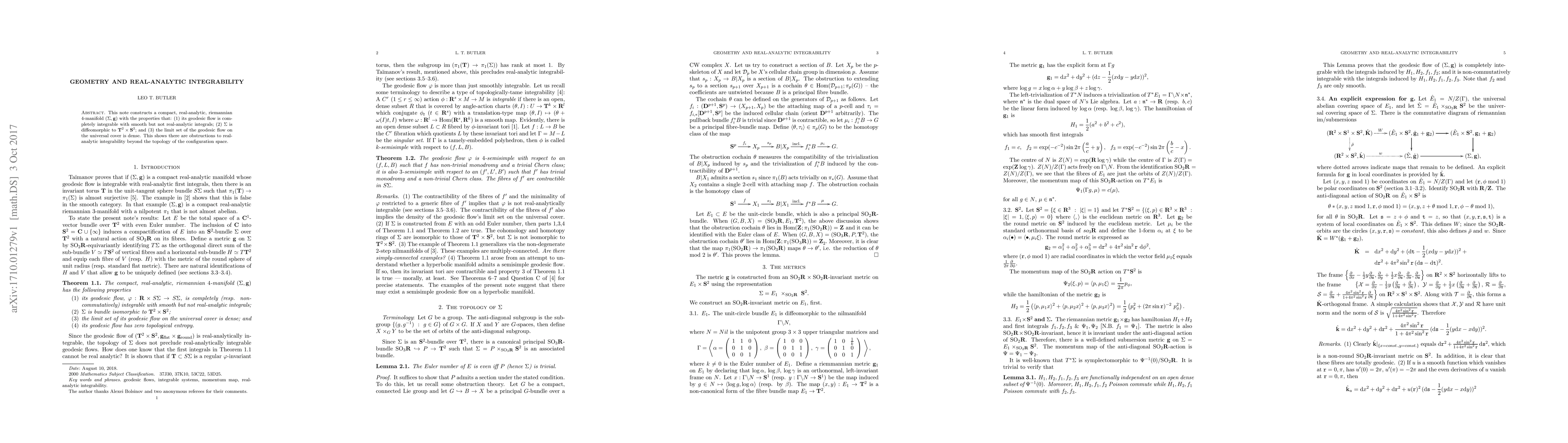 This note constructs a compact, real-analytic, riemannian 4-manifold ({\Sigma}, g) with the properties that: (1) its geodesic flow is completely integrable with smooth but not real-analytic integrals; (2) {\Sigma} is diffeomorphic to $T^2 \times S^2$ ; and (3) the limit set of the geodesic flow on the universal cover is dense. This shows there are obstructions to realanalytic integrability beyond the topology of the configuration space.
