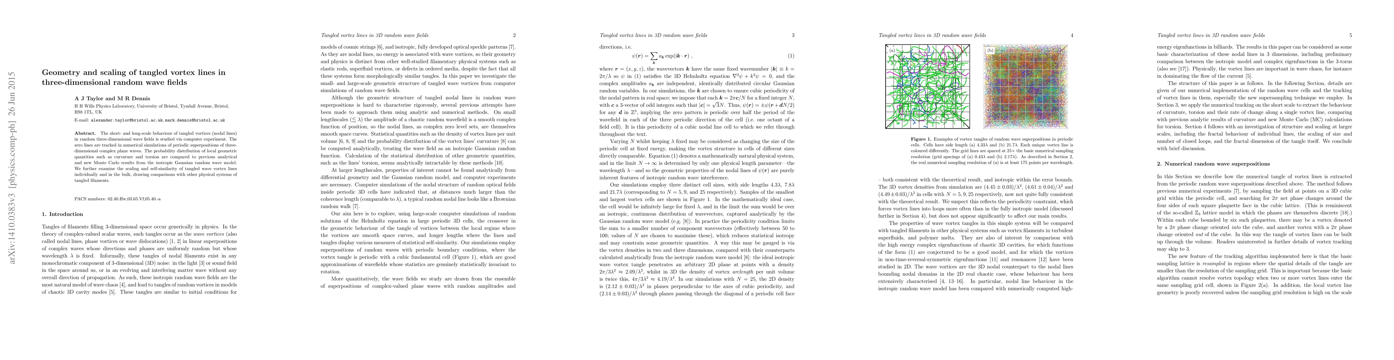 The short- and long-scale behaviour of tangled wave vortices (nodal lines) in random three-dimensional wave fields is studied via computer experiment. The zero lines are tracked in numerical simulations of periodic superpositions of three-dimensional complex plane waves. The probability distribution of local geometric quantities such as curvature and torsion are compared to previous analytical and new Monte Carlo results from the isotropic Gaussian random wave model. We further examine the scaling and self-similarity of tangled wave vortex lines individually and in the bulk, drawing comparisons with other physical systems of tangled filaments.