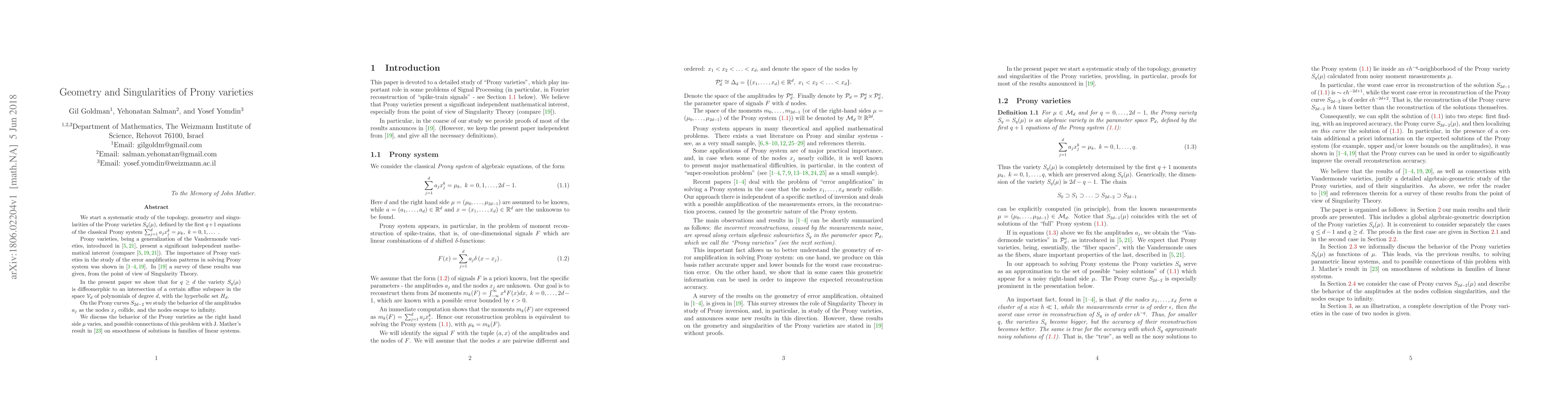 We start a systematic study of the topology, geometry and singularities of the Prony varieties $S_q(\mu)$, defined by the first $q+1$ equations of the classical Prony system $$\sum_{j=1}^d a_j x_j^k = \mu_k, \ k= 0,1,\ldots \ .$$ Prony varieties, being a generalization of the Vandermonde varieties, introduced in [5,21], present a significant independent mathematical interest (compare [5,19,21]). The importance of Prony varieties in the study of the error amplification patterns in solving Prony system was shown in [1-4,19]. In [19] a survey of these results was given, from the point of view of Singularity Theory. In the present paper we show that for $q\ge d$ the variety $S_q(\mu)$ is diffeomerphic to an intersection of a certain affine subspace in the space ${\cal V}_d$ of polynomials of degree $d$, with the hyperbolic set $H_d$. On the Prony curves $S_{2d-2}$ we study the behavior of the amplitudes $a_j$ as the nodes $x_j$ collide, and the nodes escape to infinity. We discuss the behavior of the Prony varieties as the right hand side $\mu$ varies, and possible connections of this problem with J. Mather's result in [23] on smoothness of solutions in families of linear systems.
