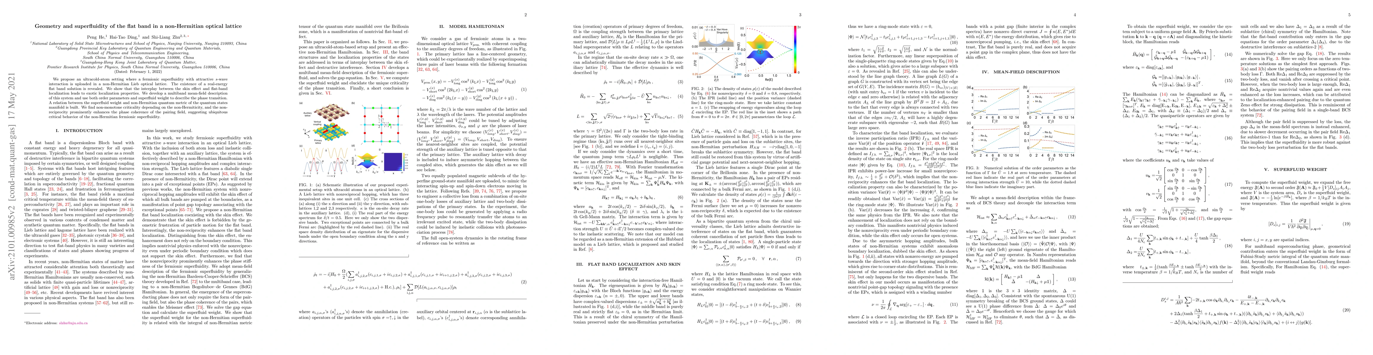 We propose an ultracold-atom setting where a fermionic superfluidity with attractive s-wave interaction is uploaded in a non-Hermitian Lieb optical lattice. The existence of a real-energy flat band solution is revealed. We show that the interplay between the skin effect and flat-band localization leads to exotic localization properties. We develop a multiband mean-field description of this system and use both order parameters and superfluid weight to describe the phase transition. A relation between the superfluid weight and non-Hermitian quantum metric of the quantum states manifold is built. We find non-monotone criticality depending on the non-Hermiticity, and the non-reciprocity prominently enhances the phase coherence of the pairing field, suggesting ubiquitous critical behavior of the non-Hermitian fermionic superfluidity.