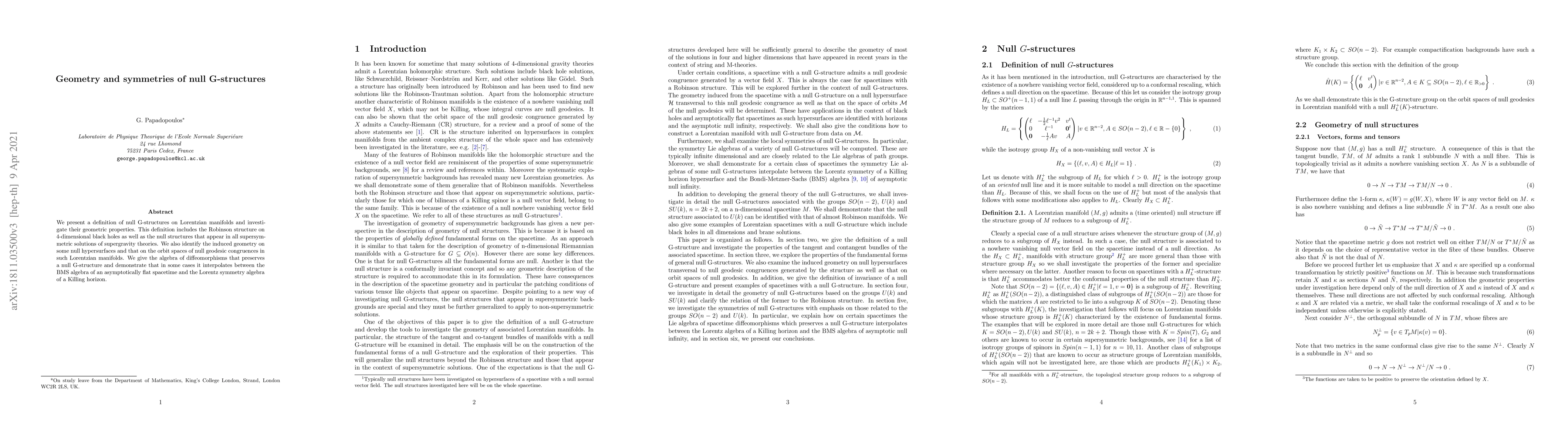 This paper defines null G-structures on Lorentzian manifolds, including Robinson structures in black holes and null structures in supersymmetric supergravity solutions. It also explores the geometry induced on null hypersurfaces and the symmetries that preserve these structures, showing their interpolation between BMS and Lorentz symmetry algebras.