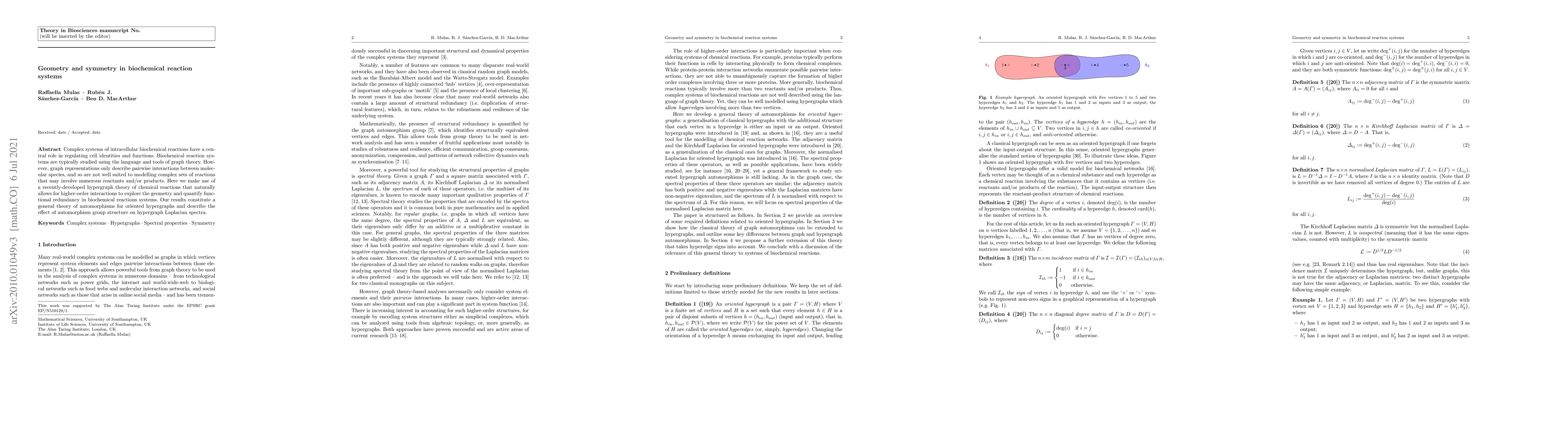 Complex systems of intracellular biochemical reactions have a central role in regulating cell identities and functions. Biochemical reaction systems are typically studied using the language and tools of graph theory. However, graph representations only describe pairwise interactions between molecular species, and so are not well suited to modelling complex sets of reactions that may involve numerous reactants and/or products. Here we make use of a recently-developed hypergraph theory of chemical reactions that naturally allows for higher-order interactions to explore the geometry and quantify functional redundancy in biochemical reactions systems. Our results constitute a general theory of automorphisms for oriented hypergraphs and describe the effect of automorphism group structure on hypergraph Laplacian spectra.
