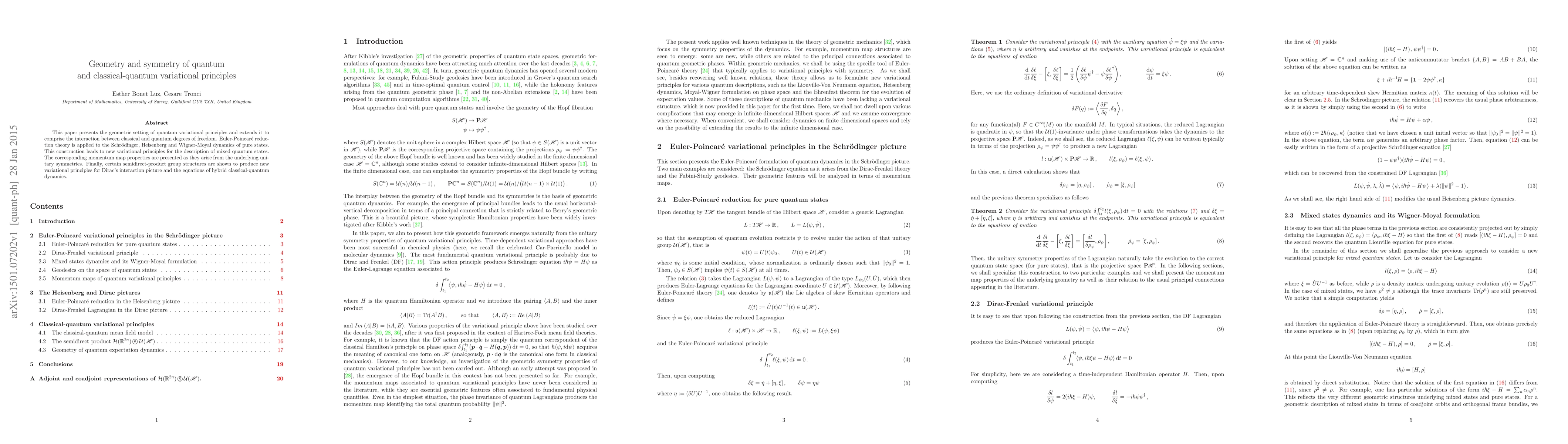 This paper explores the geometric framework of quantum variational principles and extends it to include classical-quantum interactions, utilizing Euler-Poincaré reduction to derive new variational principles for mixed quantum states and hybrid classical-quantum dynamics. It also examines the momentum map properties arising from unitary symmetries and semidirect-product group structures.