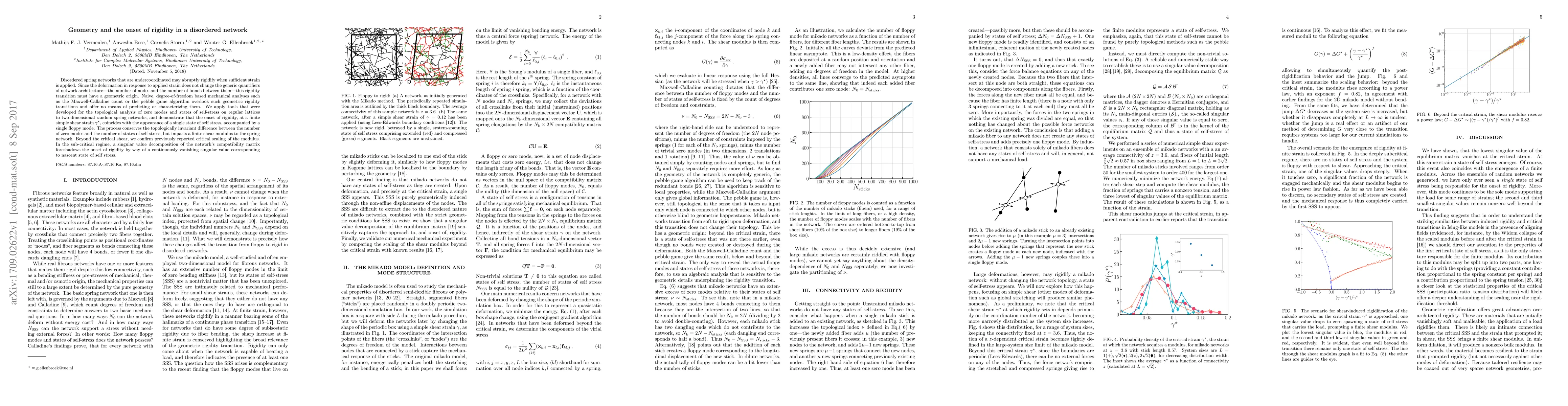 This paper investigates the geometric origin of rigidity transitions in disordered spring networks under strain, demonstrating that the onset of rigidity correlates with the emergence of a single state of self-stress and a single floppy mode. The study uses advanced topological tools to predict this transition, revealing a finite shear modulus beyond the critical strain.