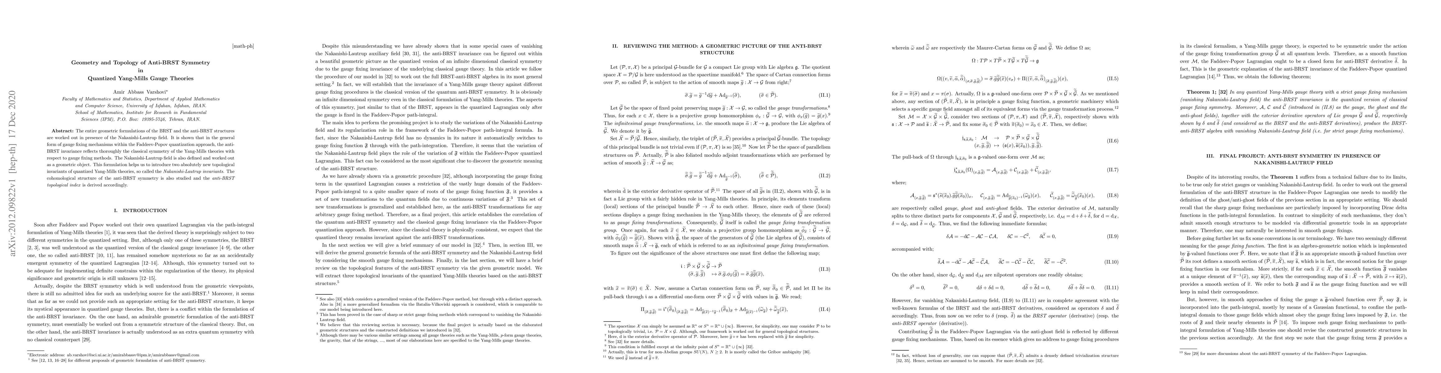 The entire geometric formulations of the BRST and the anti-BRST structures are worked out in presence of the Nakanishi-Lautrup field. It is shown that in the general form of gauge fixing mechanisms within the Faddeev-Popov quantization approach, the antiBRST invariance reflects thoroughly the classical symmetry of the Yang-Mills theories with respect to gauge fixing methods. The Nakanishi-Lautrup field is also defined and worked out as a geometric object. This formulation helps us to introduce two absolutely new topological invariants of quantized Yang-Mills theories, so called the Nakanishi-Lautrup invariants. The cohomological structure of the anti-BRST symmetry is also studied and the anti-BRST topological index is derived accordingly.