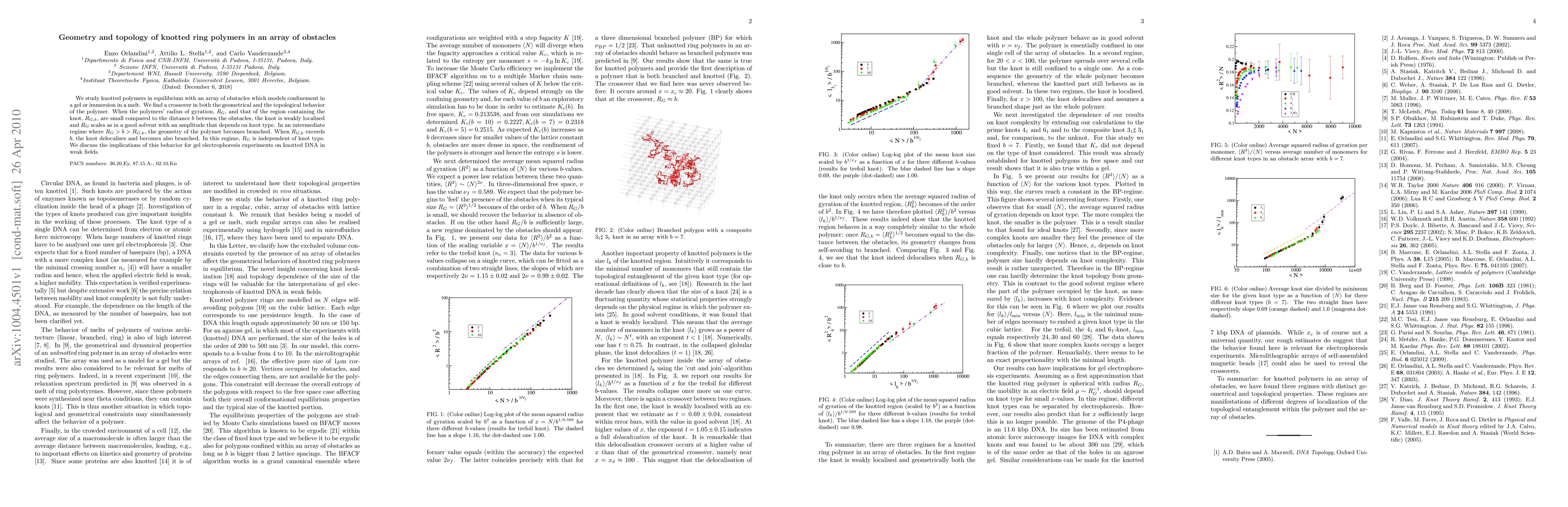 We study knotted polymers in equilibrium with an array of obstacles which models confinement in a gel or immersion in a melt. We find a crossover in both the geometrical and the topological behavior of the polymer. When the polymers' radius of gyration, $R_G$, and that of the region containing the knot, $R_{G,k}$, are small compared to the distance b between the obstacles, the knot is weakly localised and $R_G$ scales as in a good solvent with an amplitude that depends on knot type. In an intermediate regime where $R_G > b > R_{G,k}$, the geometry of the polymer becomes branched. When $R_{G,k}$ exceeds b, the knot delocalises and becomes also branched. In this regime, $R_G$ is independent of knot type. We discuss the implications of this behavior for gel electrophoresis experiments on knotted DNA in weak fields.