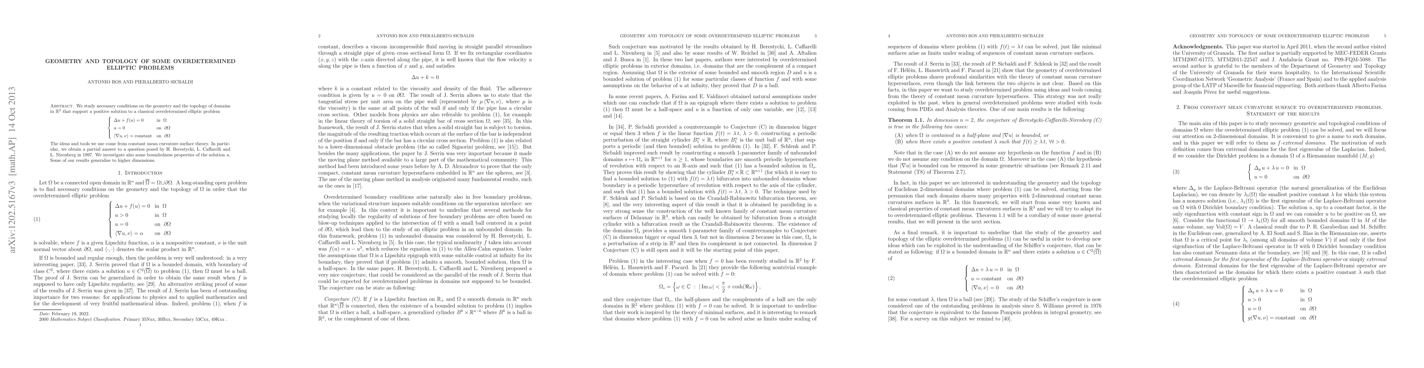 We study necessary conditions on the geometry and the topology of domains in $\mathbb{R}^2$ that support a positive solution to a classical overdetermined elliptic problem. The ideas and tools we use come from constant mean curvature surface theory. In particular, we obtain a partial answer to a question posed by H. Berestycki, L. Caffarelli and L. Nirenberg in 1997. We investigate also some boundedness properties of the solution $u$. Some of our results generalize to higher dimensions.