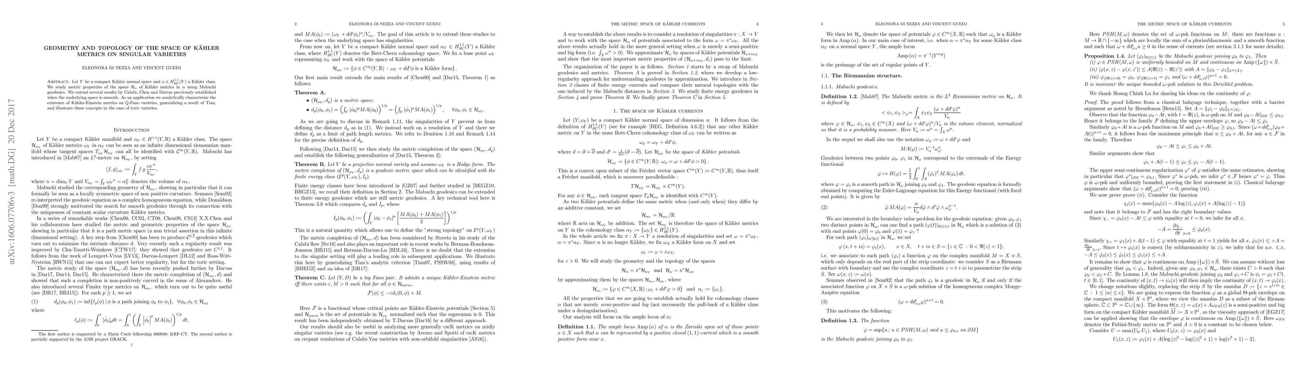 This paper explores the geometry and topology of Kähler metrics on singular varieties using Mabuchi geodesics, extending previous results for smooth spaces. It characterizes the existence of Kähler-Einstein metrics on $\mathbb{Q}$-Fano varieties and applies these findings to toric varieties.