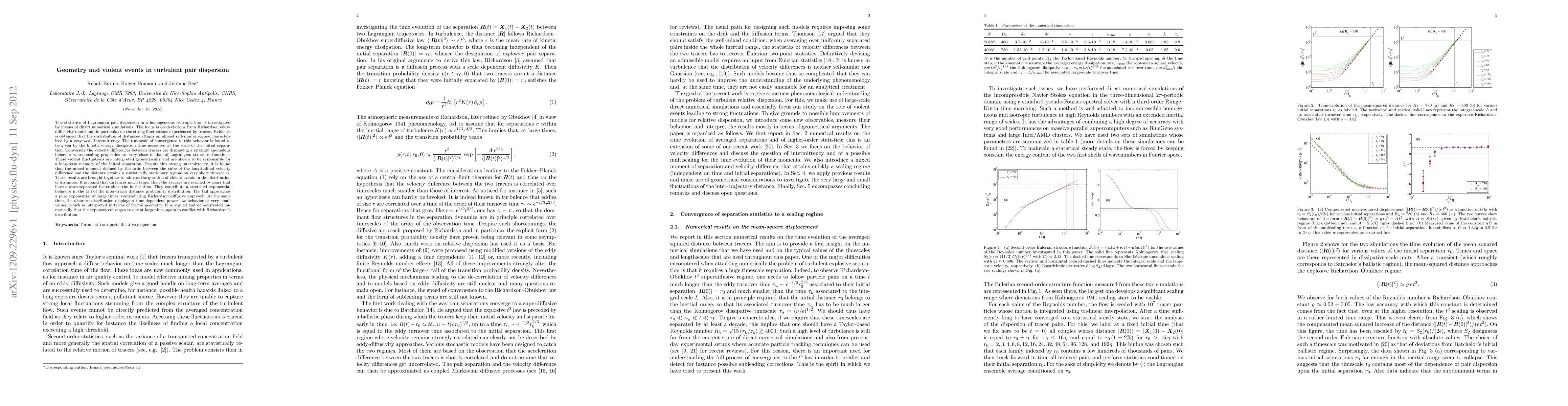 The statistics of Lagrangian pair dispersion in a homogeneous isotropic flow is investigated by means of direct numerical simulations. The focus is on deviations from Richardson eddy-diffusivity model and in particular on the strong fluctuations experienced by tracers. Evidence is obtained that the distribution of distances attains an almost self-similar regime characterized by a very weak intermittency. The timescale of convergence to this behavior is found to be given by the kinetic energy dissipation time measured at the scale of the initial separation. Conversely the velocity differences between tracers are displaying a strongly anomalous behavior whose scaling properties are very close to that of Lagrangian structure functions. These violent fluctuations are interpreted geometrically and are shown to be responsible for a long-term memory of the initial separation. Despite this strong intermittency, it is found that the mixed moment defined by the ratio between the cube of the longitudinal velocity difference and the distance attains a statistically stationary regime on very short timescales. These results are brought together to address the question of violent events in the distribution of distances. It is found that distances much larger than the average are reached by pairs that have always separated faster since the initial time. They contribute a stretched exponential behavior in the tail of the inter-tracer distance probability distribution. The tail approaches a pure exponential at large times, contradicting Richardson diffusive approach. At the same time, the distance distribution displays a time-dependent power-law behavior at very small values, which is interpreted in terms of fractal geometry. It is argued and demonstrated numerically that the exponent converges to one at large time, again in conflict with Richardson's distribution.