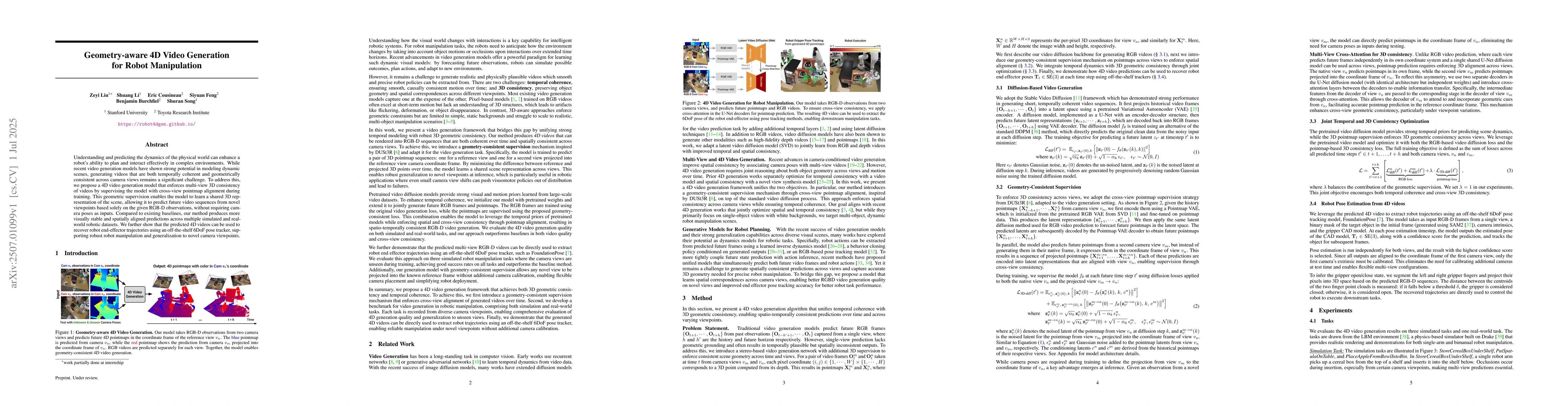 The research introduces a 4D video generation model that ensures geometric consistency across camera views, learning a shared 3D scene representation. This method, trained with cross-view pointmap alignment, produces more stable and aligned video predictions than baselines, aiding in robot manipulation and generalizing to new camera perspectives without needing camera pose inputs.