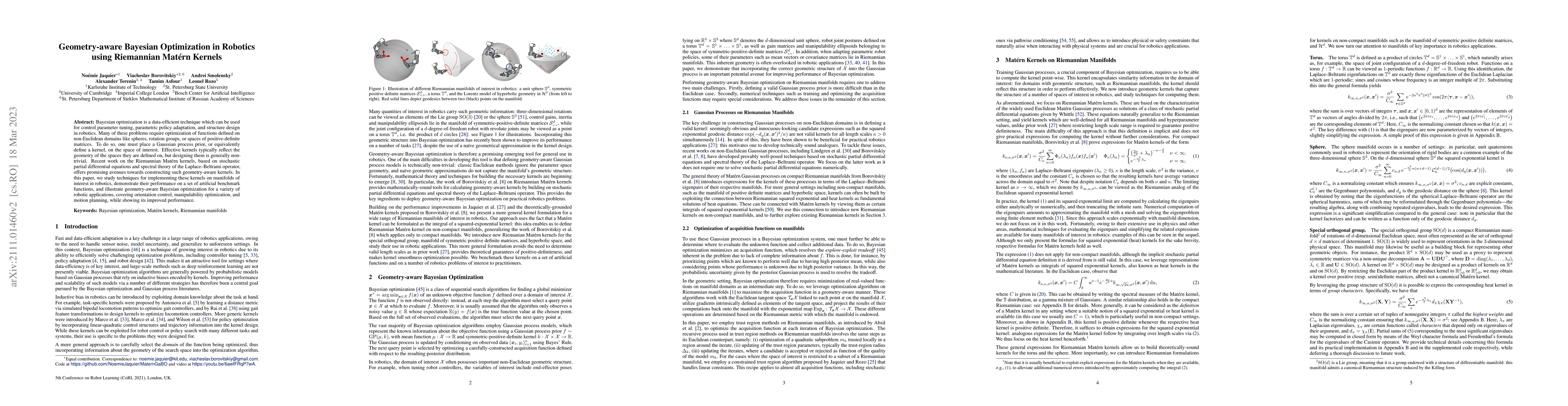 This paper explores the implementation of Riemannian Matérn kernels for geometry-aware Bayesian optimization in robotics, demonstrating enhanced performance in tasks like orientation control, manipulability optimization, and motion planning. The study showcases the effectiveness of these kernels in optimizing functions over non-Euclidean domains.