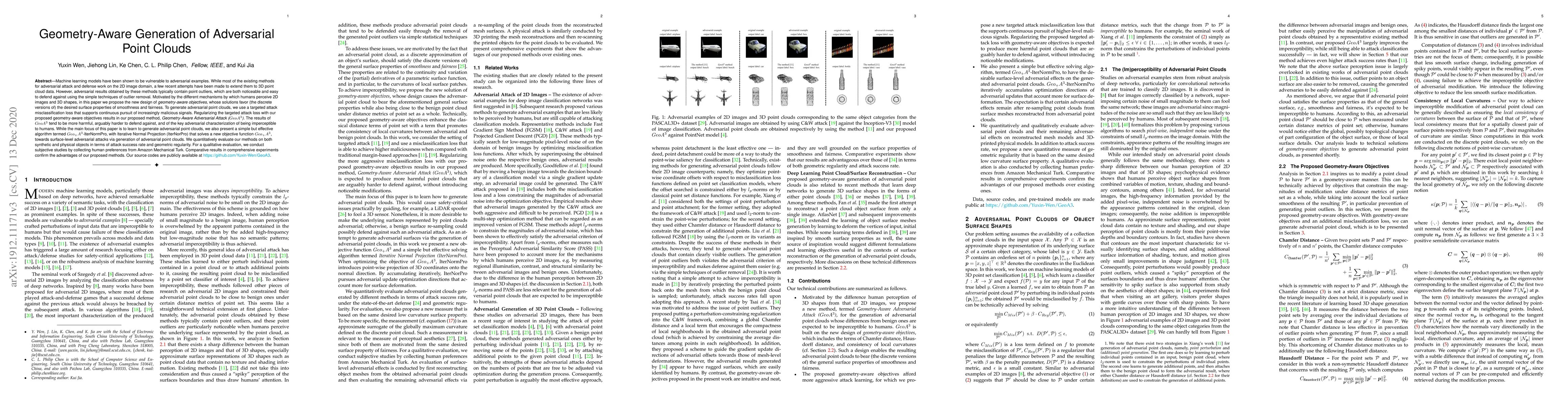 Machine learning models have been shown to be vulnerable to adversarial examples. While most of the existing methods for adversarial attack and defense work on the 2D image domain, a few recent attempts have been made to extend them to 3D point cloud data. However, adversarial results obtained by these methods typically contain point outliers, which are both noticeable and easy to defend against using the simple techniques of outlier removal. Motivated by the different mechanisms by which humans perceive 2D images and 3D shapes, in this paper we propose the new design of \emph{geometry-aware objectives}, whose solutions favor (the discrete versions of) the desired surface properties of smoothness and fairness. To generate adversarial point clouds, we use a targeted attack misclassification loss that supports continuous pursuit of increasingly malicious signals. Regularizing the targeted attack loss with our proposed geometry-aware objectives results in our proposed method, Geometry-Aware Adversarial Attack ($GeoA^3$). The results of $GeoA^3$ tend to be more harmful, arguably harder to defend against, and of the key adversarial characterization of being imperceptible to humans. While the main focus of this paper is to learn to generate adversarial point clouds, we also present a simple but effective algorithm termed $Geo_{+}A^3$-IterNormPro, with Iterative Normal Projection (IterNorPro) that solves a new objective function $Geo_{+}A^3$, towards surface-level adversarial attacks via generation of adversarial point clouds. We quantitatively evaluate our methods on both synthetic and physical objects in terms of attack success rate and geometric regularity. For a qualitative evaluation, we conduct subjective studies by collecting human preferences from Amazon Mechanical Turk. Comparative results in comprehensive experiments confirm the advantages of our proposed methods.