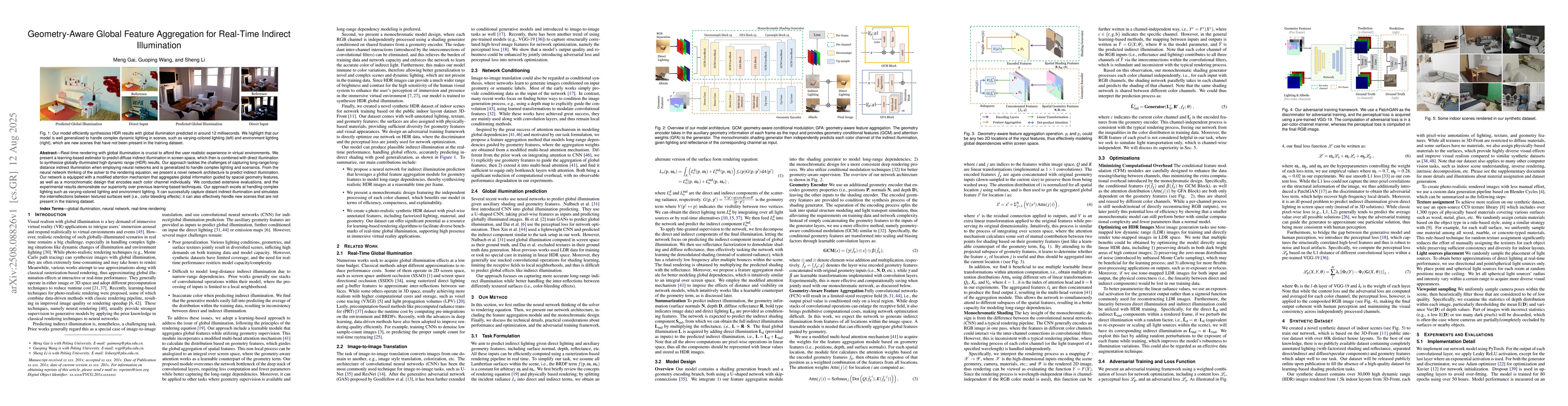 Real-time rendering with global illumination is crucial to afford the user realistic experience in virtual environments. We present a learning-based estimator to predict diffuse indirect illumination in screen space, which then is combined with direct illumination to synthesize globally-illuminated high dynamic range (HDR) results. Our approach tackles the challenges of capturing long-range/long-distance indirect illumination when employing neural networks and is generalized to handle complex lighting and scenarios. From the neural network thinking of the solver to the rendering equation, we present a novel network architecture to predict indirect illumination. Our network is equipped with a modified attention mechanism that aggregates global information guided by spacial geometry features, as well as a monochromatic design that encodes each color channel individually. We conducted extensive evaluations, and the experimental results demonstrate our superiority over previous learning-based techniques. Our approach excels at handling complex lighting such as varying-colored lighting and environment lighting. It can successfully capture distant indirect illumination and simulates the interreflections between textured surfaces well (i.e., color bleeding effects); it can also effectively handle new scenes that are not present in the training dataset.