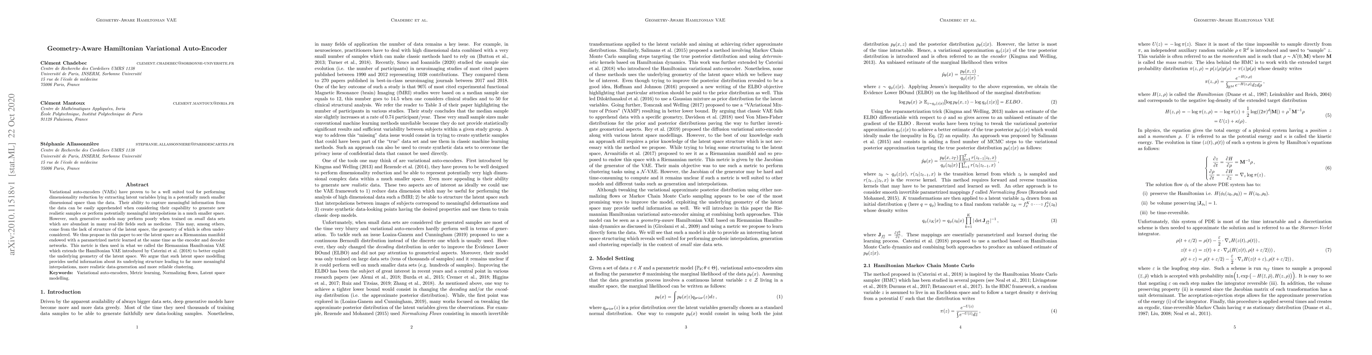 This paper proposes a Geometry-Aware Hamiltonian Variational Auto-Encoder that models the latent space as a Riemannian manifold with a learned metric. This approach enhances the latent space's geometry, leading to more meaningful interpolations, realistic data generation, and reliable clustering, especially beneficial for small datasets.