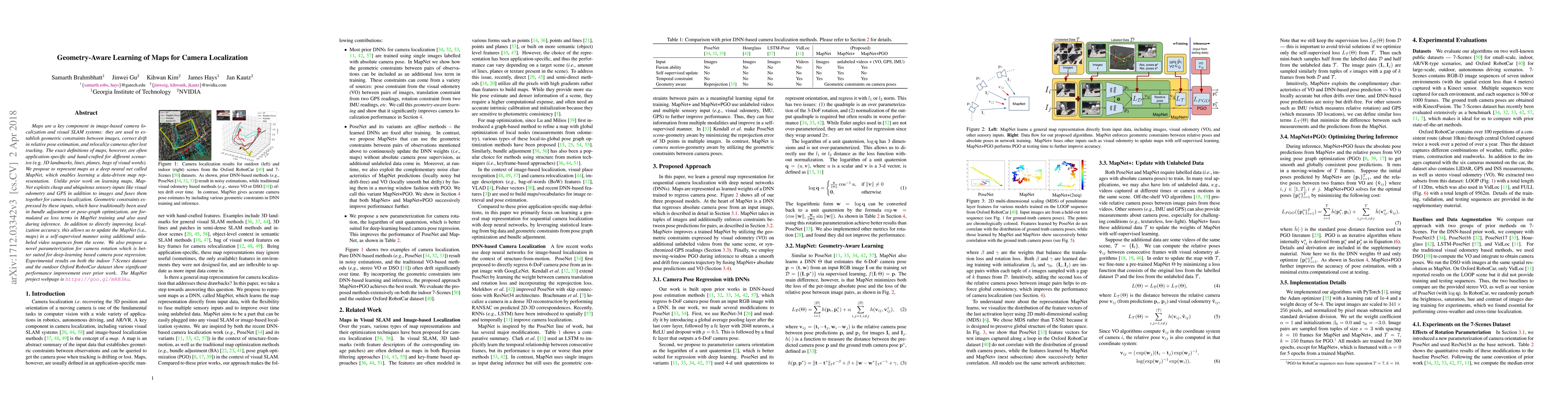 This paper proposes MapNet, a deep neural network for learning data-driven map representations for camera localization, leveraging visual odometry, GPS, and images. It improves localization accuracy and enables self-supervised map updates using unlabeled video sequences, demonstrating significant performance gains on indoor and outdoor datasets.