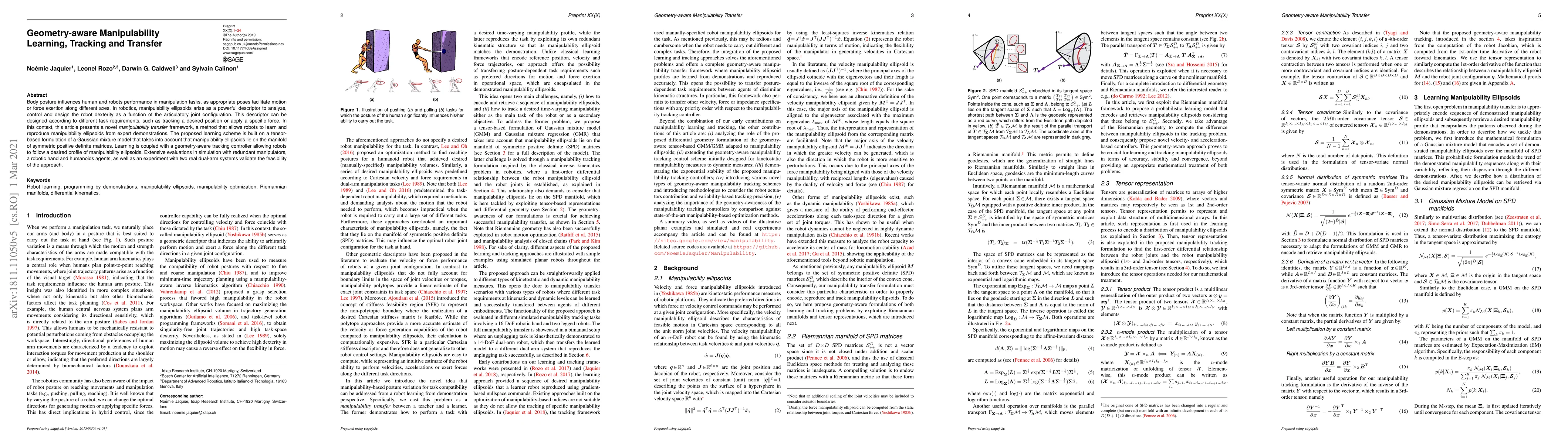 Body posture influences human and robots performance in manipulation tasks, as appropriate poses facilitate motion or force exertion along different axes. In robotics, manipulability ellipsoids arise as a powerful descriptor to analyze, control and design the robot dexterity as a function of the articulatory joint configuration. This descriptor can be designed according to different task requirements, such as tracking a desired position or apply a specific force. In this context, this paper presents a novel \emph{manipulability transfer} framework, a method that allows robots to learn and reproduce manipulability ellipsoids from expert demonstrations. The proposed learning scheme is built on a tensor-based formulation of a Gaussian mixture model that takes into account that manipulability ellipsoids lie on the manifold of symmetric positive definite matrices. Learning is coupled with a geometry-aware tracking controller allowing robots to follow a desired profile of manipulability ellipsoids. Extensive evaluations in simulation with redundant manipulators, a robotic hand and humanoids agents, as well as an experiment with two real dual-arm systems validate the feasibility of the approach.