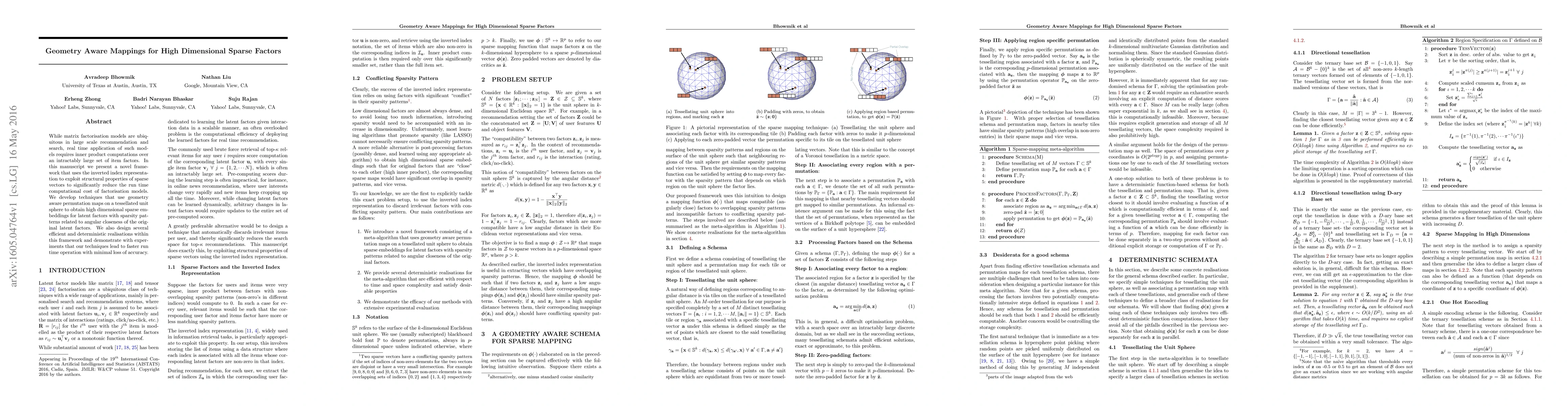 While matrix factorisation models are ubiquitous in large scale recommendation and search, real time application of such models requires inner product computations over an intractably large set of item factors. In this manuscript we present a novel framework that uses the inverted index representation to exploit structural properties of sparse vectors to significantly reduce the run time computational cost of factorisation models. We develop techniques that use geometry aware permutation maps on a tessellated unit sphere to obtain high dimensional sparse embeddings for latent factors with sparsity patterns related to angular closeness of the original latent factors. We also design several efficient and deterministic realisations within this framework and demonstrate with experiments that our techniques lead to faster run time operation with minimal loss of accuracy.