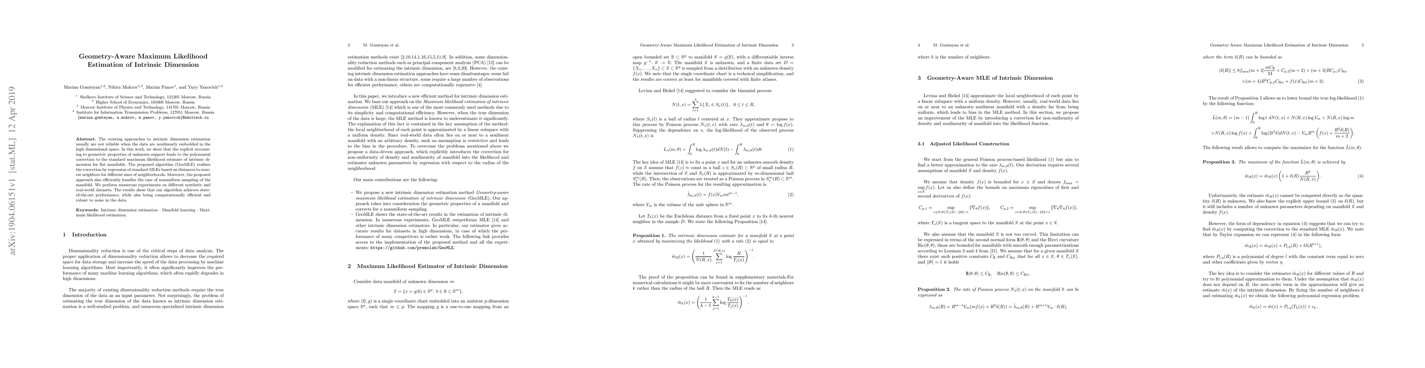 This paper proposes a geometry-aware maximum likelihood estimation (GeoMLE) algorithm to improve intrinsic dimension estimation for nonlinearly embedded data. The method corrects the standard maximum likelihood estimate by incorporating geometric properties and distances to nearest neighbors, achieving state-of-the-art performance on both synthetic and real datasets.