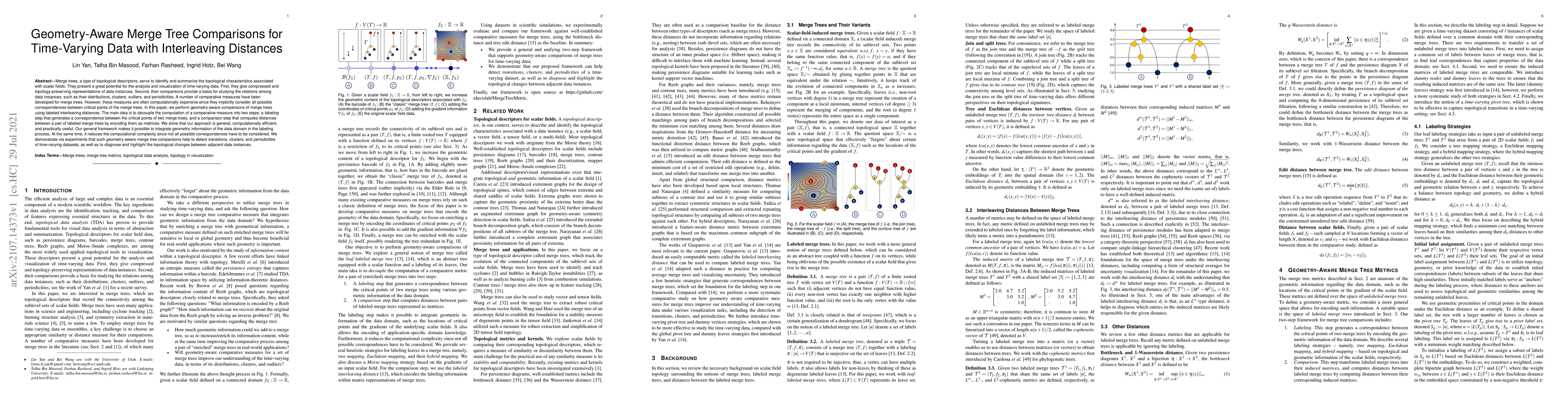 Merge trees, a type of topological descriptor, serve to identify and summarize the topological characteristics associated with scalar fields. They present a great potential for the analysis and visualization of time-varying data. First, they give compressed and topology-preserving representations of data instances. Second, their comparisons provide a basis for studying the relations among data instances, such as their distributions, clusters, outliers, and periodicities. A number of comparative measures have been developed for merge trees. However, these measures are often computationally expensive since they implicitly consider all possible correspondences between critical points of the merge trees. In this paper, we perform geometry-aware comparisons of merge trees using labeled interleaving distances. The main idea is to decouple the computation of a comparative measure into two steps: a labeling step that generates a correspondence between the critical points of two merge trees, and a comparison step that computes distances between a pair of labeled merge trees by encoding them as matrices. We show that our approach is general, computationally efficient, and practically useful. Our general framework makes it possible to integrate geometric information of the data domain in the labeling process. At the same time, it reduces the computational complexity since not all possible correspondences have to be considered. We demonstrate via experiments that such geometry-aware merge tree comparisons help to detect transitions, clusters, and periodicities of time-varying datasets, as well as to diagnose and highlight the topological changes between adjacent data instances.
