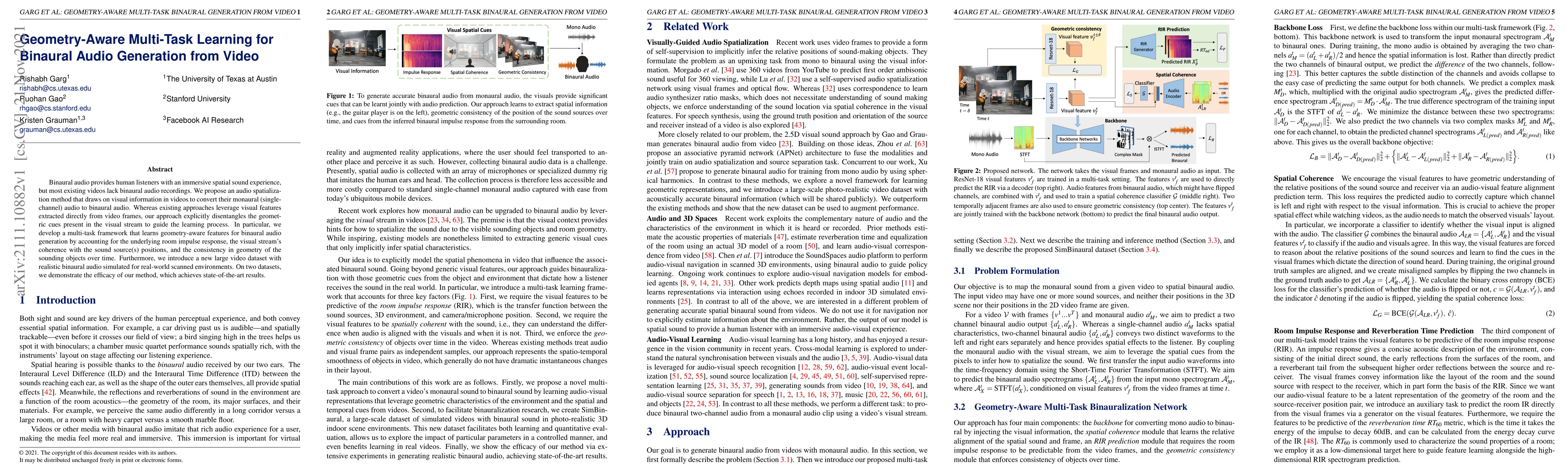 This paper proposes a geometry-aware multi-task learning framework to convert monaural audio from videos into immersive binaural audio by leveraging visual cues. The method disentangles geometric information from video frames to guide audio spatialization, achieving superior results compared to existing approaches.