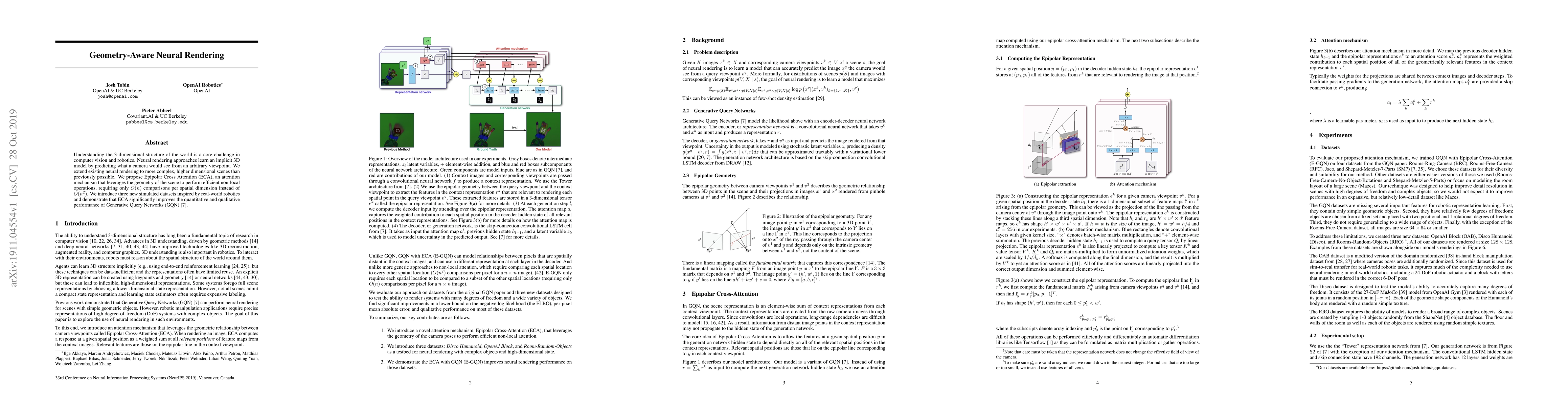 Understanding the 3-dimensional structure of the world is a core challenge in computer vision and robotics. Neural rendering approaches learn an implicit 3D model by predicting what a camera would see from an arbitrary viewpoint. We extend existing neural rendering to more complex, higher dimensional scenes than previously possible. We propose Epipolar Cross Attention (ECA), an attention mechanism that leverages the geometry of the scene to perform efficient non-local operations, requiring only $O(n)$ comparisons per spatial dimension instead of $O(n^2)$. We introduce three new simulated datasets inspired by real-world robotics and demonstrate that ECA significantly improves the quantitative and qualitative performance of Generative Query Networks (GQN).