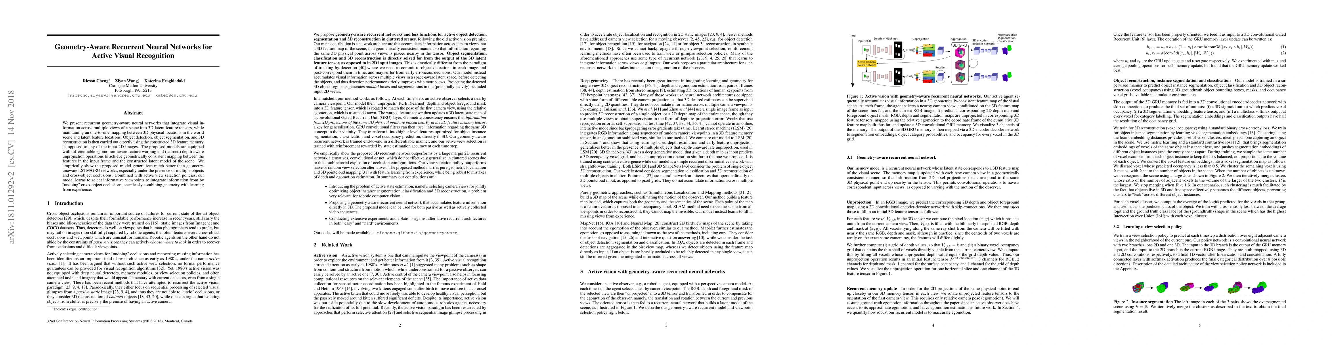 We present recurrent geometry-aware neural networks that integrate visual information across multiple views of a scene into 3D latent feature tensors, while maintaining an one-to-one mapping between 3D physical locations in the world scene and latent feature locations. Object detection, object segmentation, and 3D reconstruction is then carried out directly using the constructed 3D feature memory, as opposed to any of the input 2D images. The proposed models are equipped with differentiable egomotion-aware feature warping and (learned) depth-aware unprojection operations to achieve geometrically consistent mapping between the features in the input frame and the constructed latent model of the scene. We empirically show the proposed model generalizes much better than geometryunaware LSTM/GRU networks, especially under the presence of multiple objects and cross-object occlusions. Combined with active view selection policies, our model learns to select informative viewpoints to integrate information from by "undoing" cross-object occlusions, seamlessly combining geometry with learning from experience.