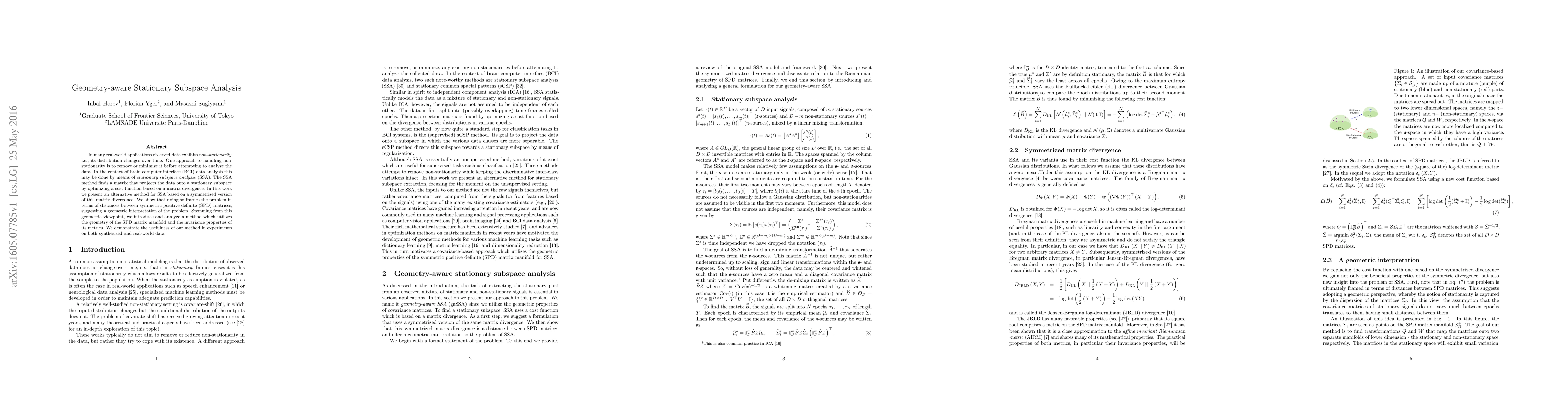 This paper presents a geometry-aware method for stationary subspace analysis that leverages the geometric properties of symmetric positive definite matrices to improve accuracy on synthesized and real-world data without whitening the input matrices.