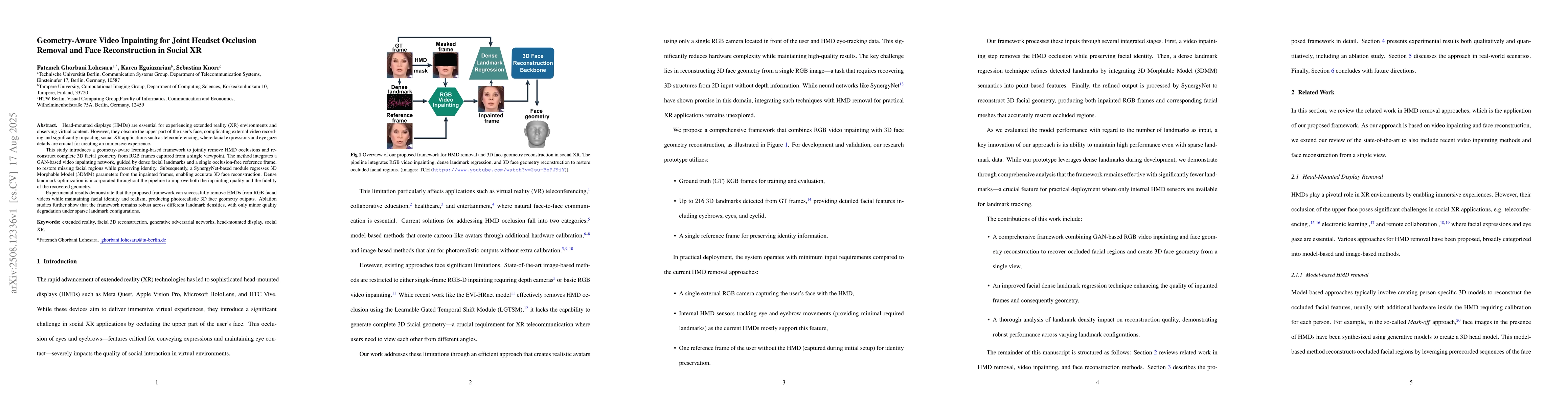 Head-mounted displays (HMDs) are essential for experiencing extended reality (XR) environments and observing virtual content. However, they obscure the upper part of the user's face, complicating external video recording and significantly impacting social XR applications such as teleconferencing, where facial expressions and eye gaze details are crucial for creating an immersive experience. This study introduces a geometry-aware learning-based framework to jointly remove HMD occlusions and reconstruct complete 3D facial geometry from RGB frames captured from a single viewpoint. The method integrates a GAN-based video inpainting network, guided by dense facial landmarks and a single occlusion-free reference frame, to restore missing facial regions while preserving identity. Subsequently, a SynergyNet-based module regresses 3D Morphable Model (3DMM) parameters from the inpainted frames, enabling accurate 3D face reconstruction. Dense landmark optimization is incorporated throughout the pipeline to improve both the inpainting quality and the fidelity of the recovered geometry. Experimental results demonstrate that the proposed framework can successfully remove HMDs from RGB facial videos while maintaining facial identity and realism, producing photorealistic 3D face geometry outputs. Ablation studies further show that the framework remains robust across different landmark densities, with only minor quality degradation under sparse landmark configurations.