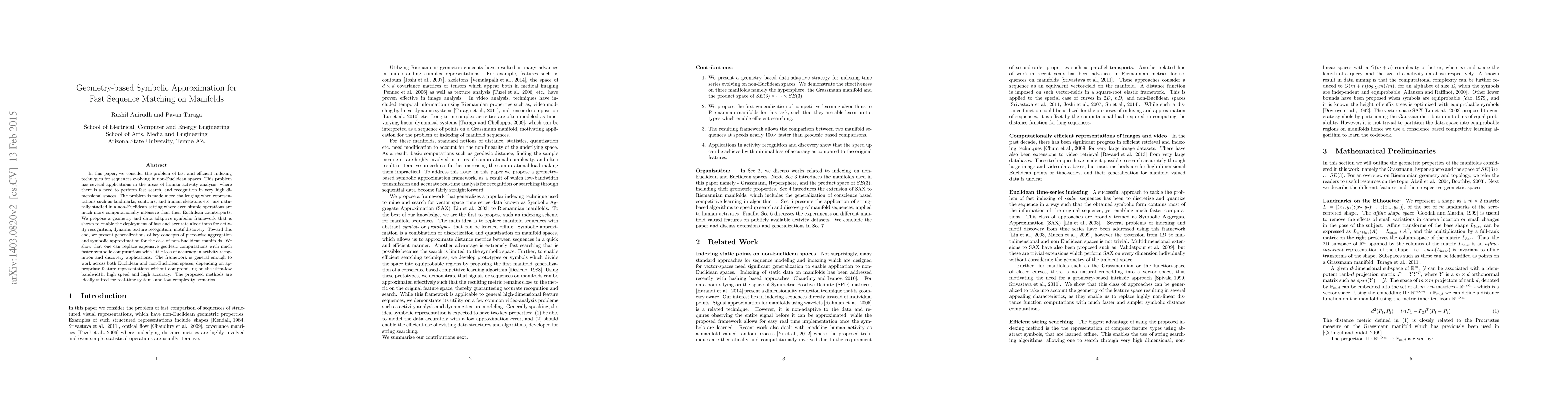 In this paper, we consider the problem of fast and efficient indexing techniques for sequences evolving in non-Euclidean spaces. This problem has several applications in the areas of human activity analysis, where there is a need to perform fast search, and recognition in very high dimensional spaces. The problem is made more challenging when representations such as landmarks, contours, and human skeletons etc. are naturally studied in a non-Euclidean setting where even simple operations are much more computationally intensive than their Euclidean counterparts. We propose a geometry and data adaptive symbolic framework that is shown to enable the deployment of fast and accurate algorithms for activity recognition, dynamic texture recognition, motif discovery. Toward this end, we present generalizations of key concepts of piece-wise aggregation and symbolic approximation for the case of non-Euclidean manifolds. We show that one can replace expensive geodesic computations with much faster symbolic computations with little loss of accuracy in activity recognition and discovery applications. The framework is general enough to work across both Euclidean and non-Euclidean spaces, depending on appropriate feature representations without compromising on the ultra-low bandwidth, high speed and high accuracy. The proposed methods are ideally suited for real-time systems and low complexity scenarios.