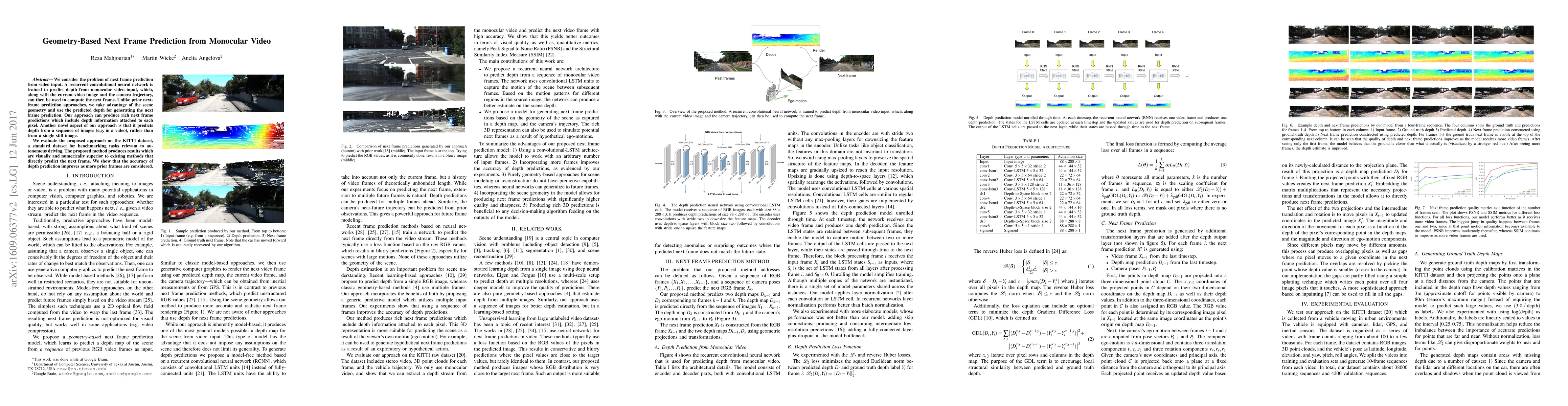 This paper proposes a recurrent convolutional neural network to predict depth from monocular video, leveraging scene geometry to generate next frame predictions with depth information. Evaluated on the KITTI dataset, the method outperforms existing next-frame prediction techniques, especially when considering multiple prior frames.