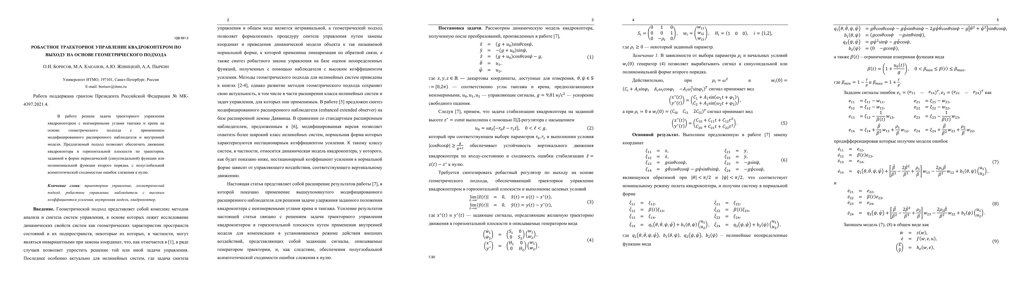 The paper solves the problem of tracking control of a quadrotor with unmeasurable pitch and roll angles based on the geometric approach with the use of the enhanced extended observer and the internal model. The proposed approach makes it possible to ensure the movement of a quadrotor in a horizontal plane along a trajectory given in the form of a sinusoidal or second-order polynomial function with semiglobal asymptotic convergence of the tracking errors to zero.